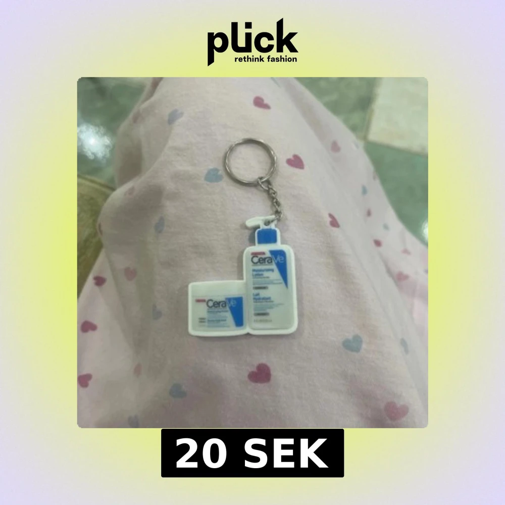 Rolig nyckelring med två miniatyrer av CeraVe lotionflaskor i vitt och blått. Perfekt accessoar för dig som älskar hudvård och vill ha något unikt på dina nycklar eller väskan.