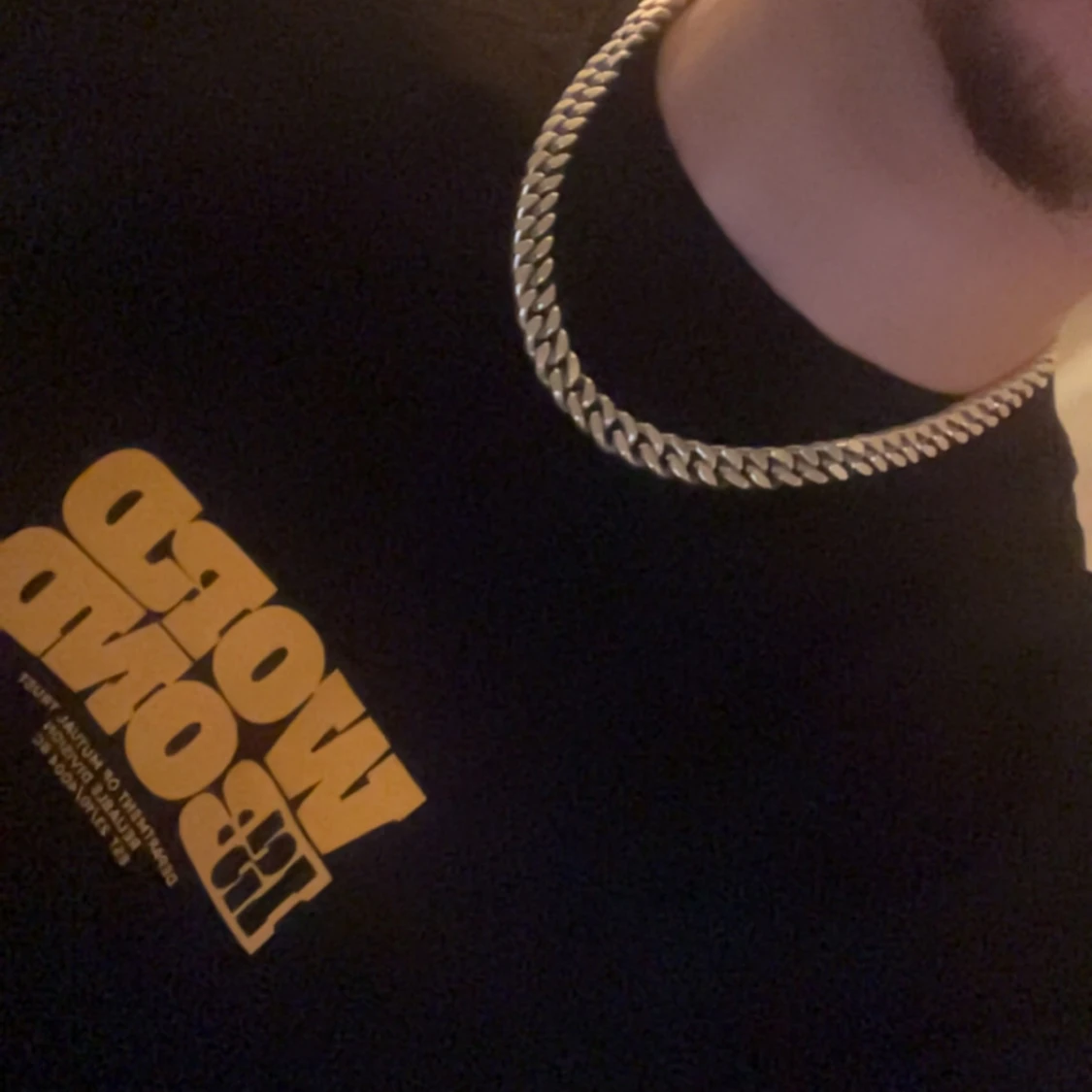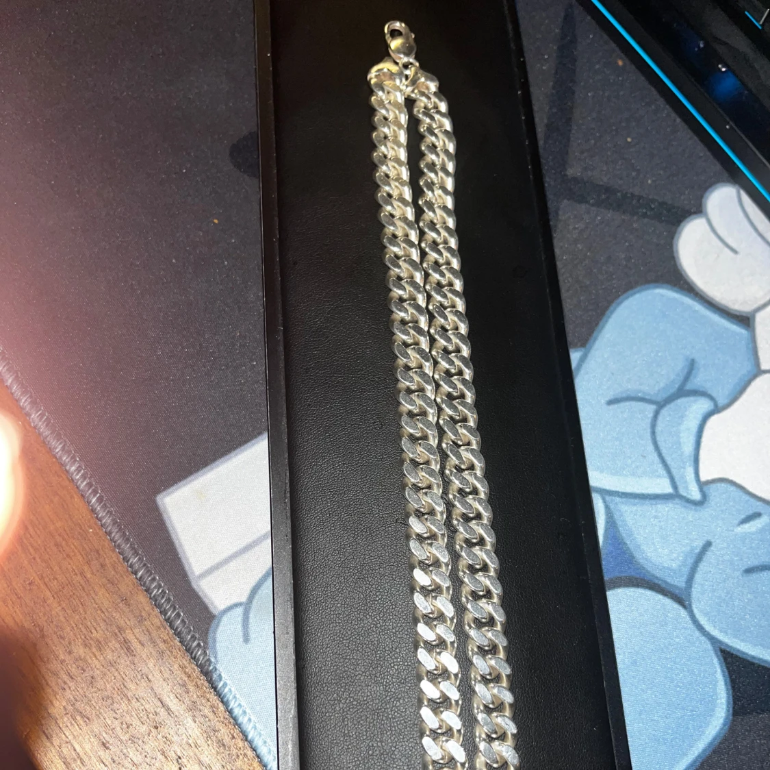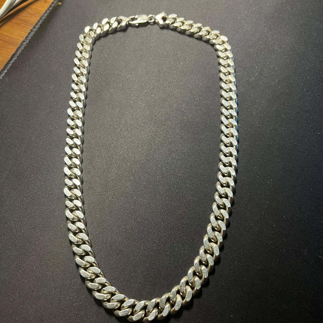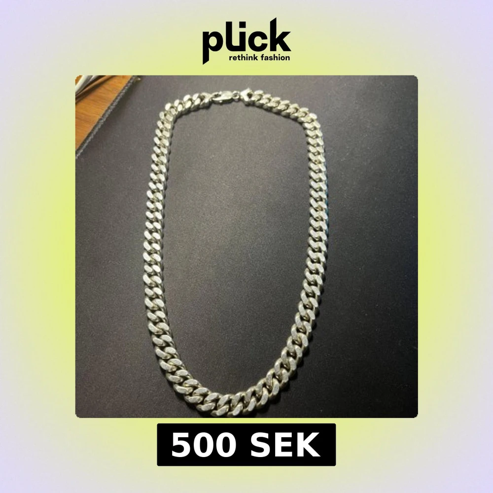 Säljer ett 750 karat silver chunky halsband i silverfärg med breda, platta länkar i klassisk cuban chain-stil. Kedjan har en robust karbinhake och ger en riktigt clean och modern vibe. Perfekt för dig som vill sticka ut med en fet accessoar runt halsen.