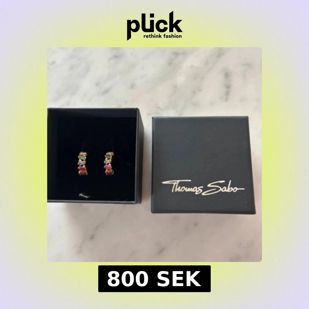 Säljer ett par snygga örhängen från Thomas Sabo i guldton med rektangulära stenar i flera färger som röd, grön, lila och rosa. De är små hoops som ger en cool och färgstark touch till din stil. Kommer i originalask.