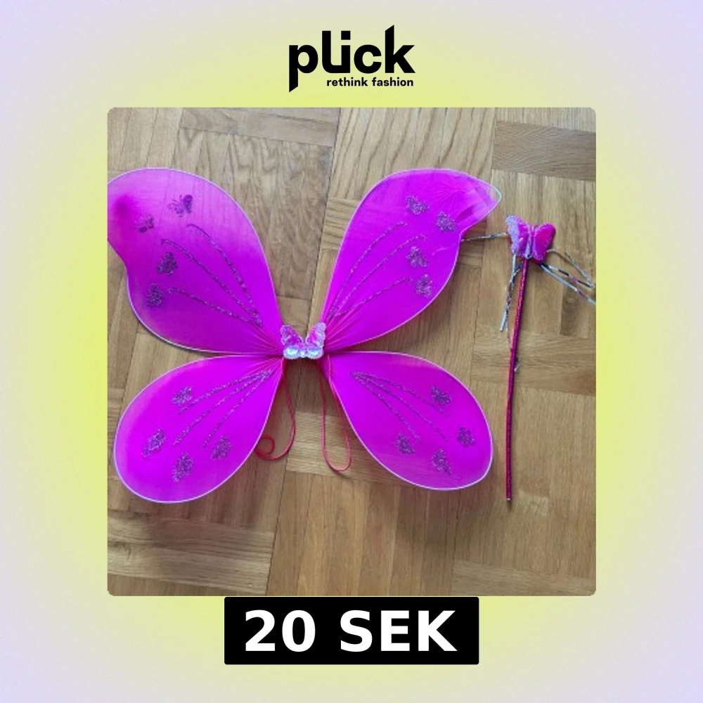 Säljer ett set med ett rosa diadem med fjäril och matchande stora fjärilsvingar. Diademet har glittriga detaljer och silvriga band, vingarna är dekorerade med glitterfjärilar och har elastiska band för att sitta bra. Perfekt för maskerad eller temafest.