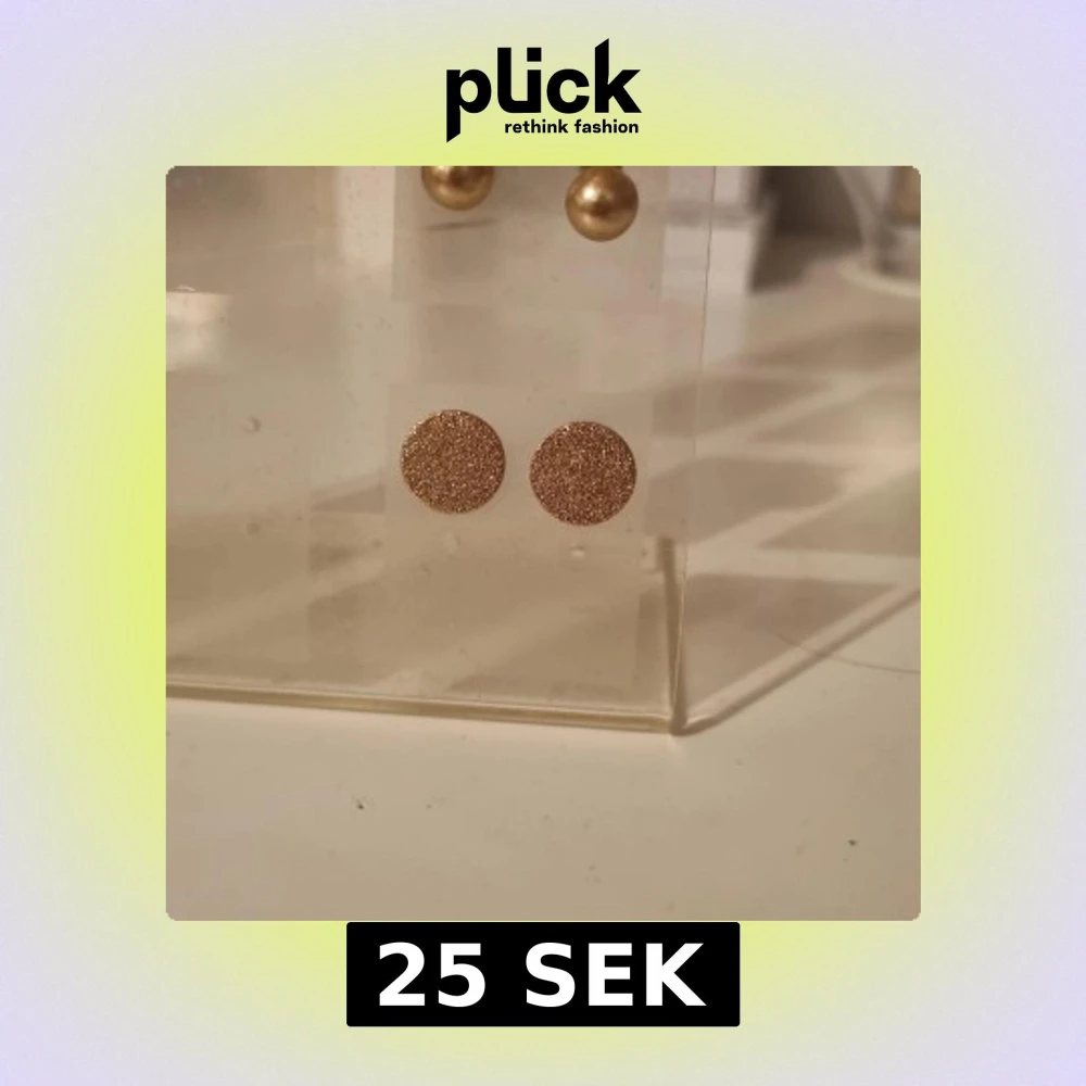 Säljer ett par snygga örhängen i rund form med glittrig yta i guldton. Perfekta för dig som vill ha något enkelt men ändå iögonfallande. Stiftmodell som sitter bekvämt på örat och ger en cool touch till din stil.