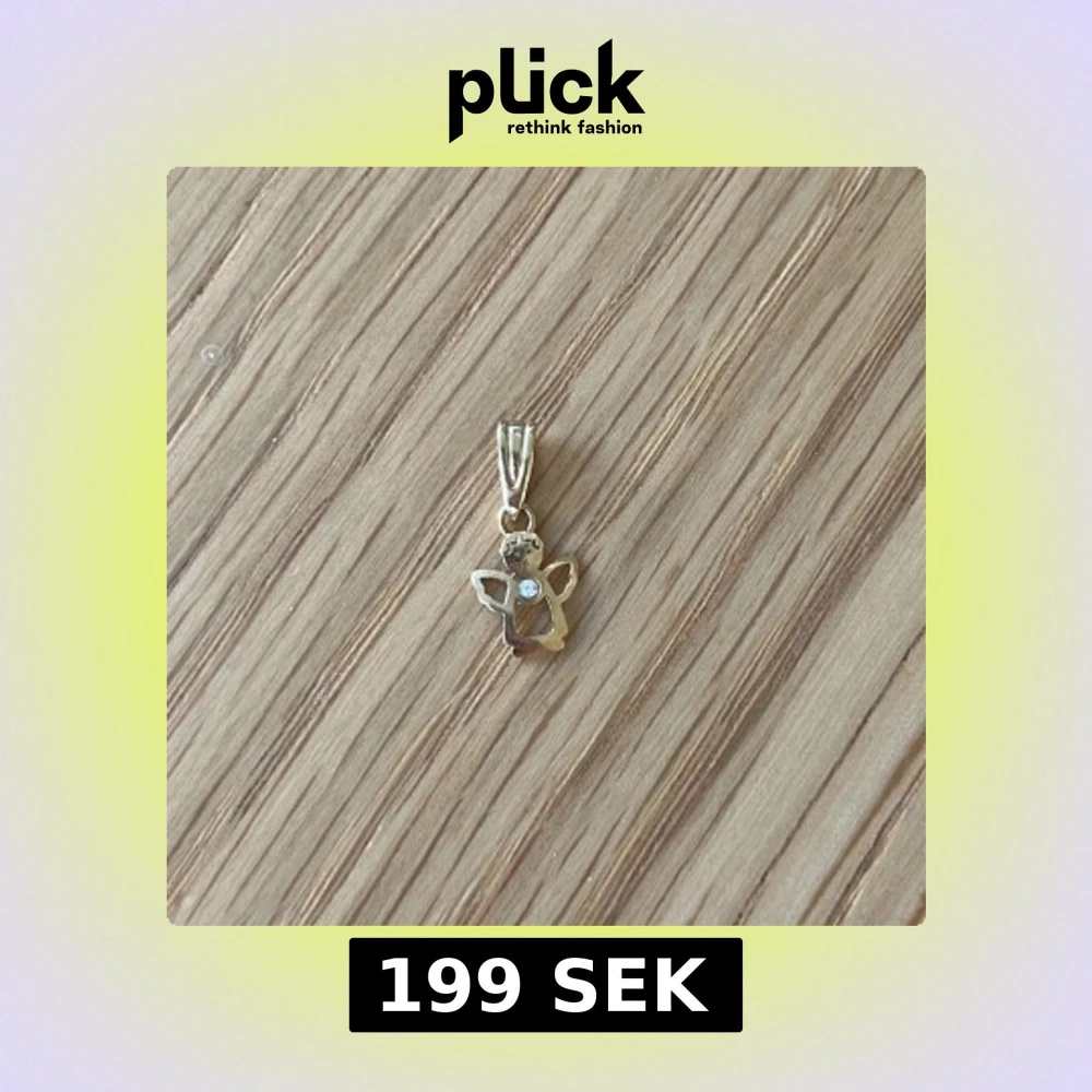 Ängel-berlock i guld med en vit sten. Passar till att hänga på halsband. Märket är okänt.