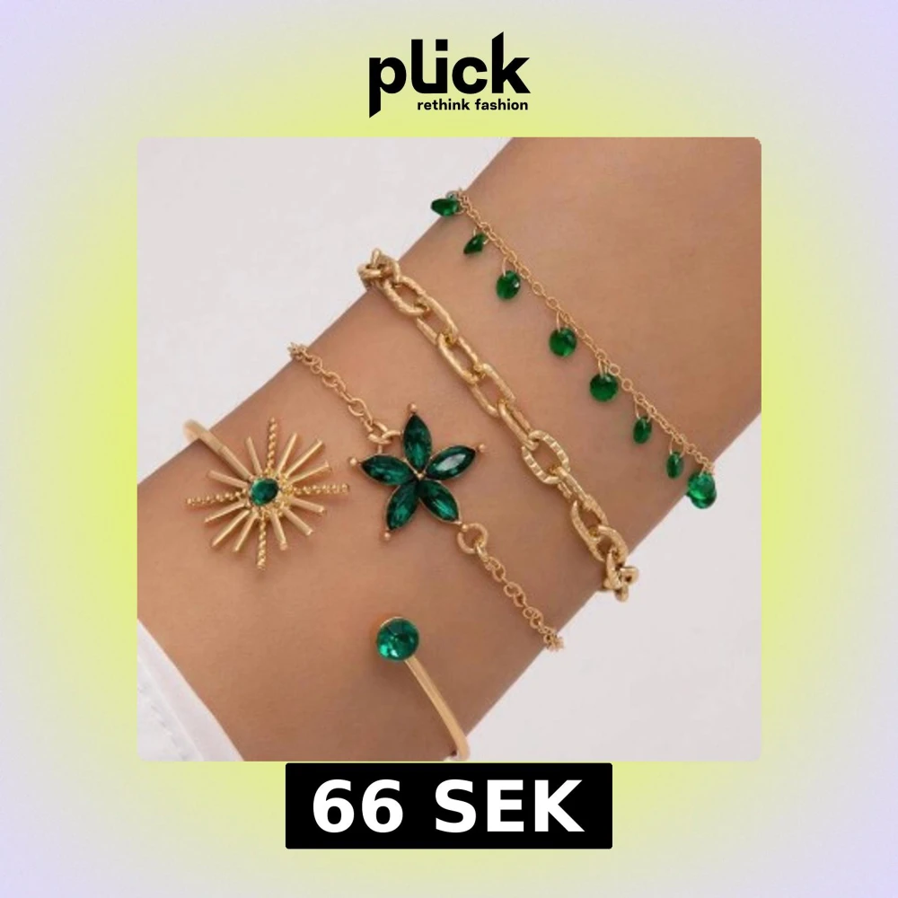 Fyra trendiga guldarmband med gröna stenar i olika former. Ett armband har en blomformad dekoration, ett har solstråle-design, ett är kedja med gröna droppar och ett är öppet med en grön sten i varje ände. Perfekt för att mixa och matcha.