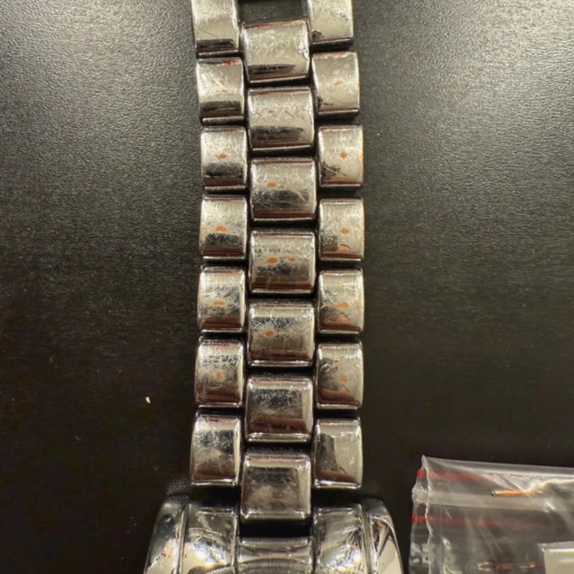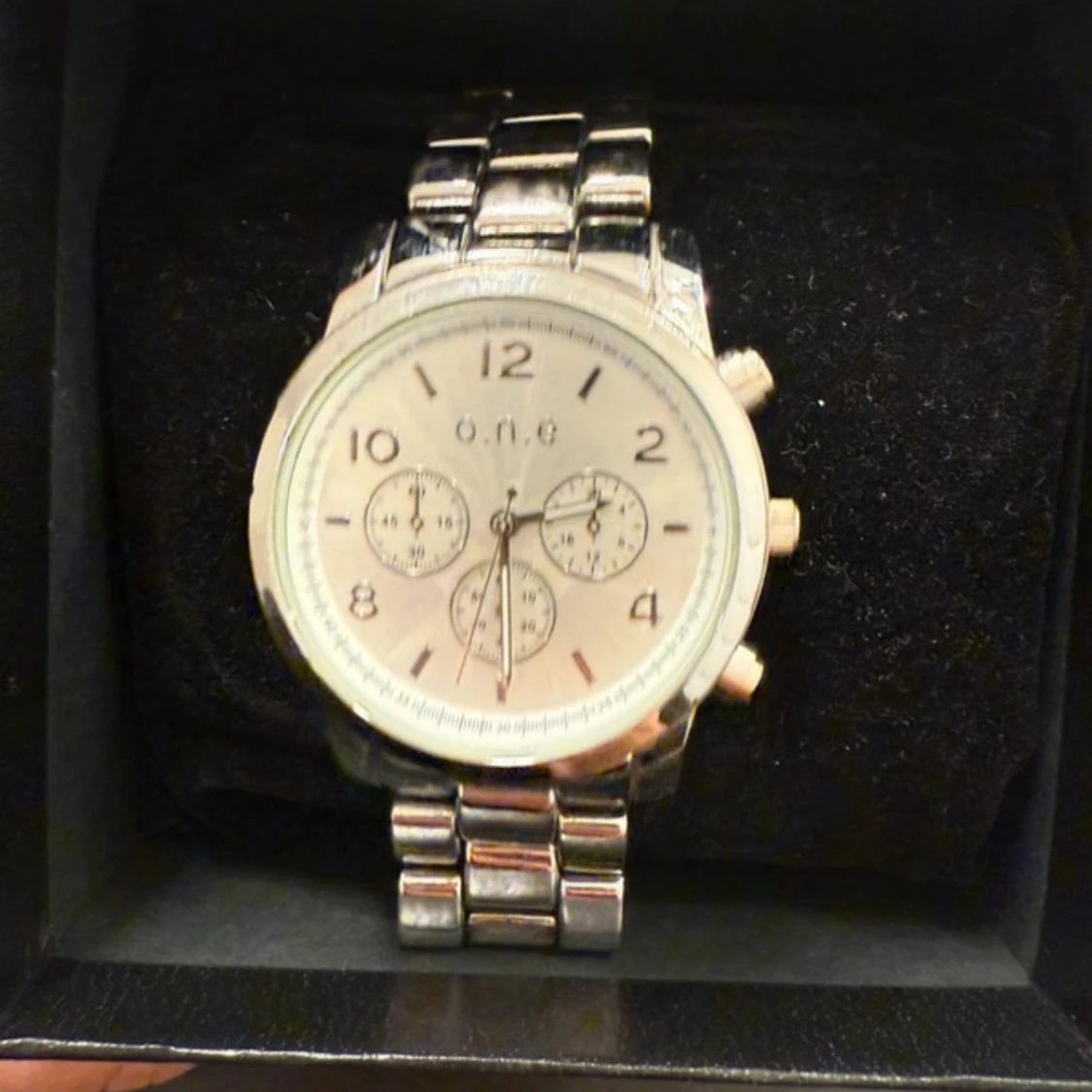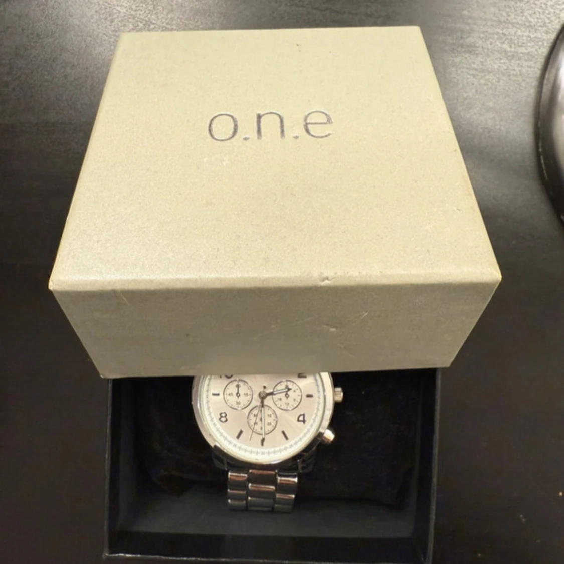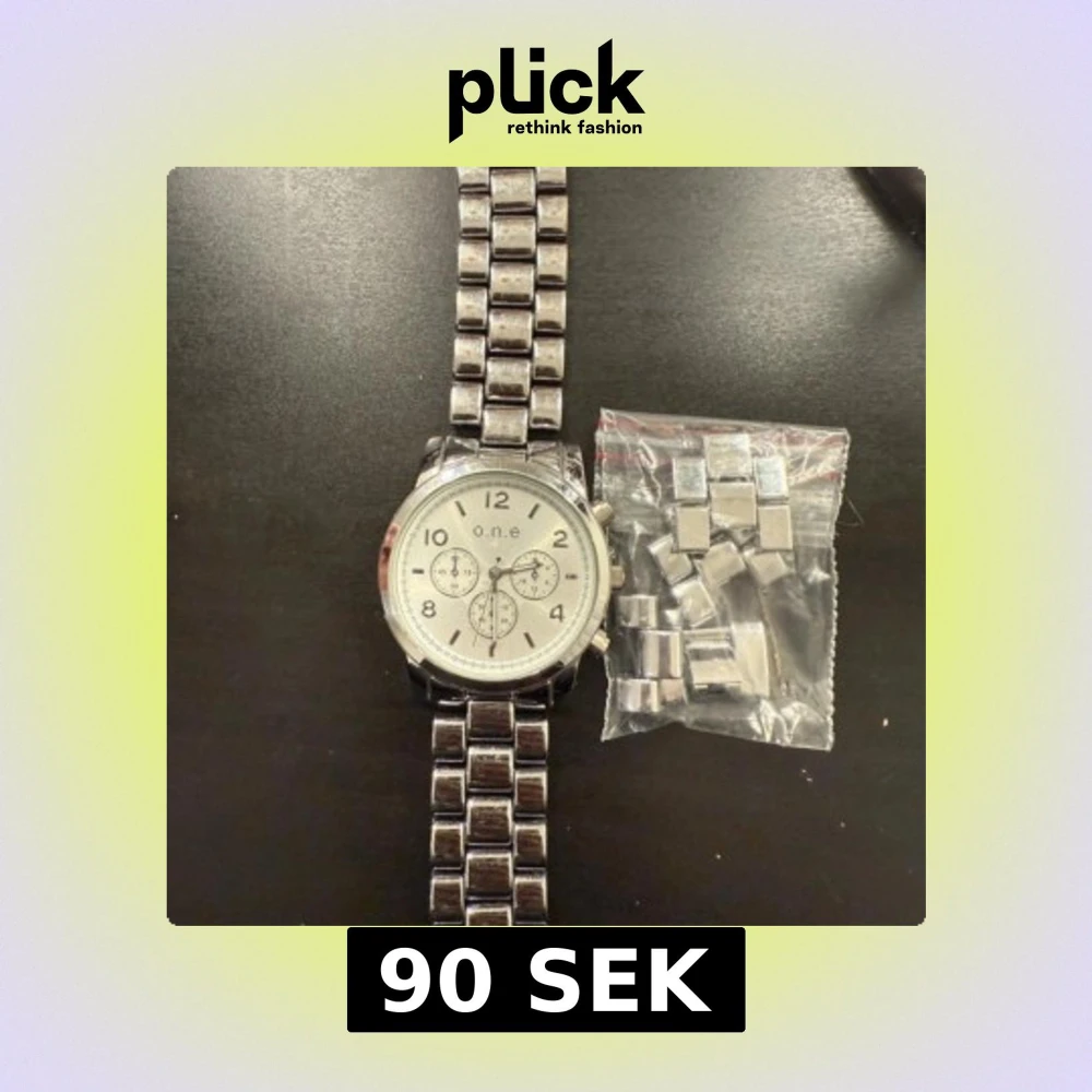 Stilren klocka från o.n.e med silverfärgad länkarmband och rund urtavla. Urtavlan är ljus med tydliga siffror och tre mindre visartavlor. Klockan levereras i originalask och extra länkar medföljer för enkel justering av storlek. Lite missfärgad som ni kan se på bild, behöver batteribyte