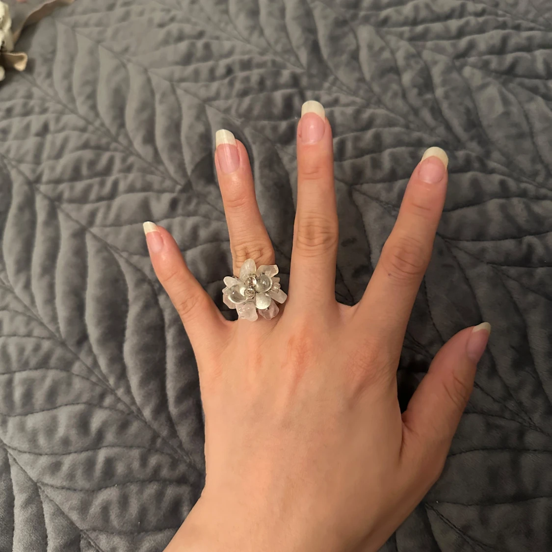 Unik statementring i silverfärgad metall med stora, klara stenar och pärlor i en blomliknande form. Ringen har en cool, handgjord känsla och är perfekt för dig som vill sticka ut. Justerbar storlek och riktigt snygg detalj till din outfit.