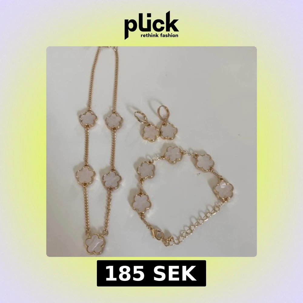 Snyggt smyckeset med halsband, armband och örhängen i guldpläterad metall. Alla delar har vita blommor i pärlemor-look, infattade i guldram. Kedjorna är tunna och eleganta, och blommorna har en mjuk, rundad form som ger en lyxig känsla.