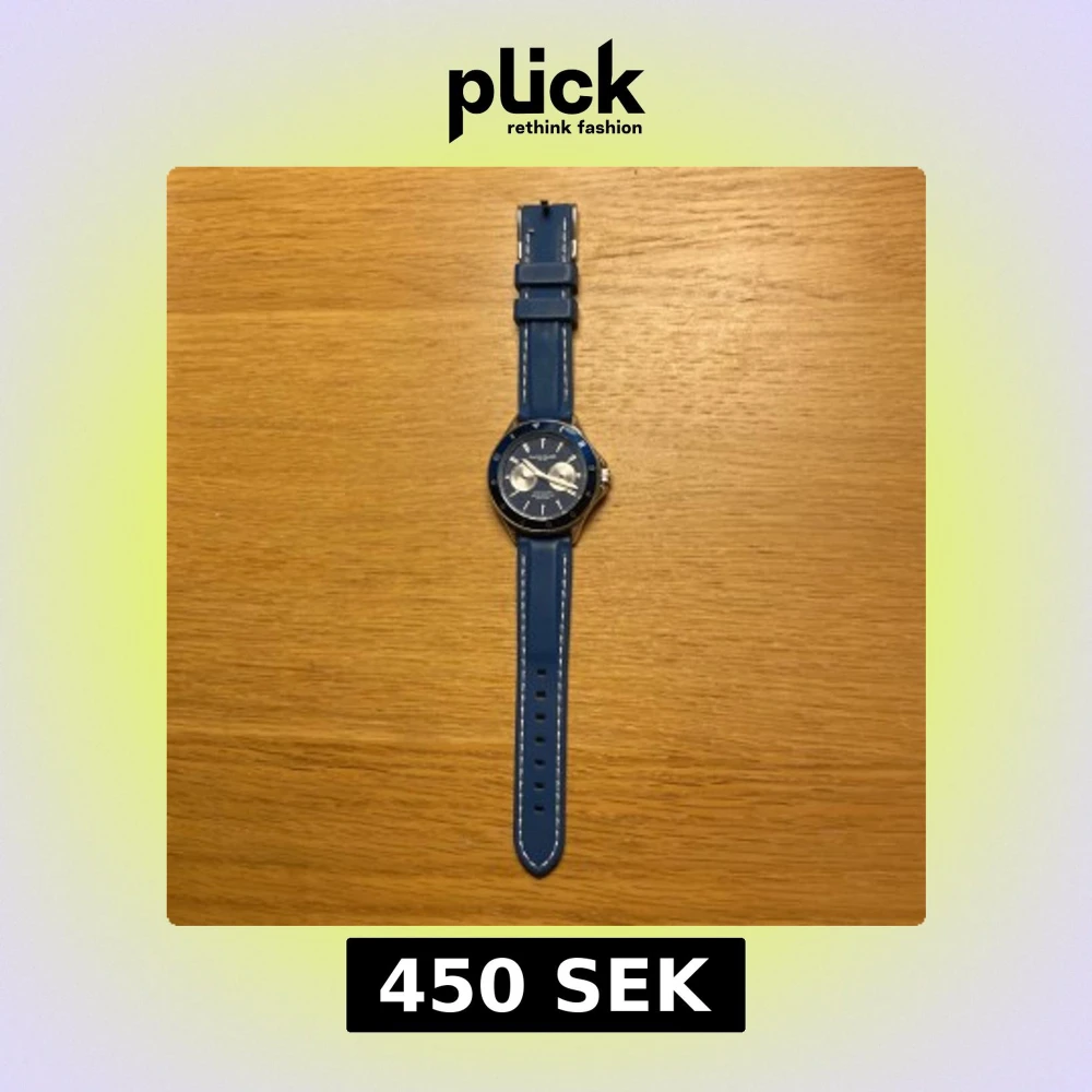 Snygg klocka från Philippe Palmer med blått armband och blå urtavla. Klockan har silverfärgade detaljer, två mindre urtavlor och tydliga siffror på ringen. Armbandet är i syntetmaterial med vita sömmar. Vattentät till 30 meter och har japanskt kvartsverk. Knappt använd