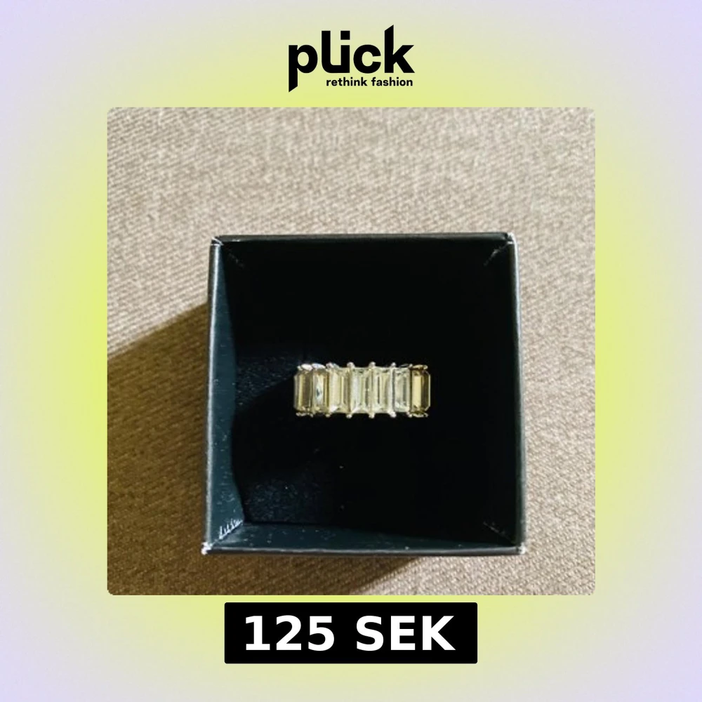 Säljer ett set med smycken: en bred ring i guldton med rektangulära stenar, ett par hjärtformade örhängen med glittriga stenar och pärldetaljer, ett armband i tre färger (guld, silver, koppar) samt två par örhängen i silver, ett par hjärtformade och ett par stavformade med små stenar.