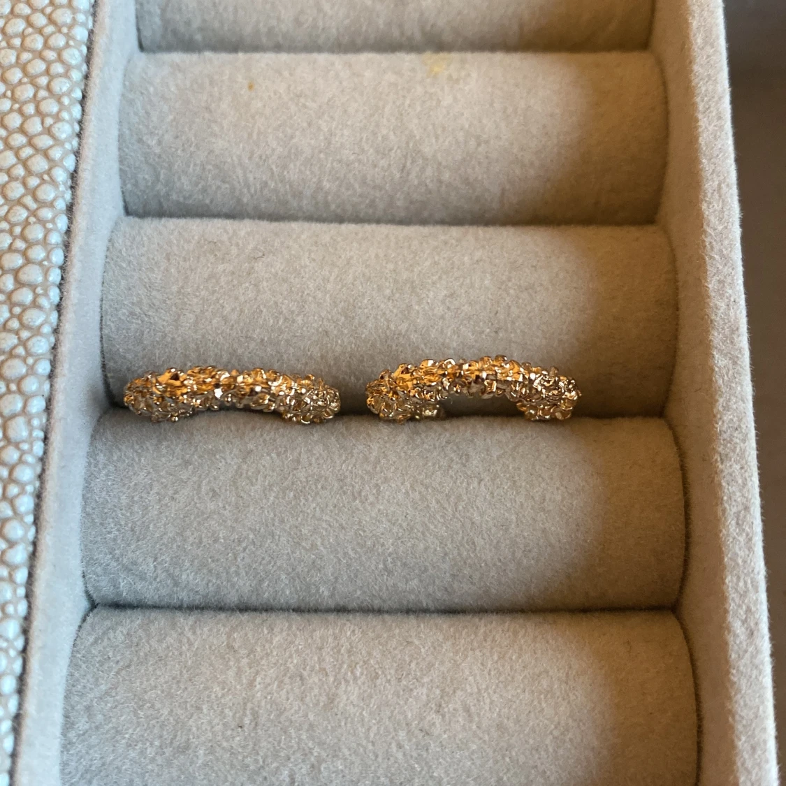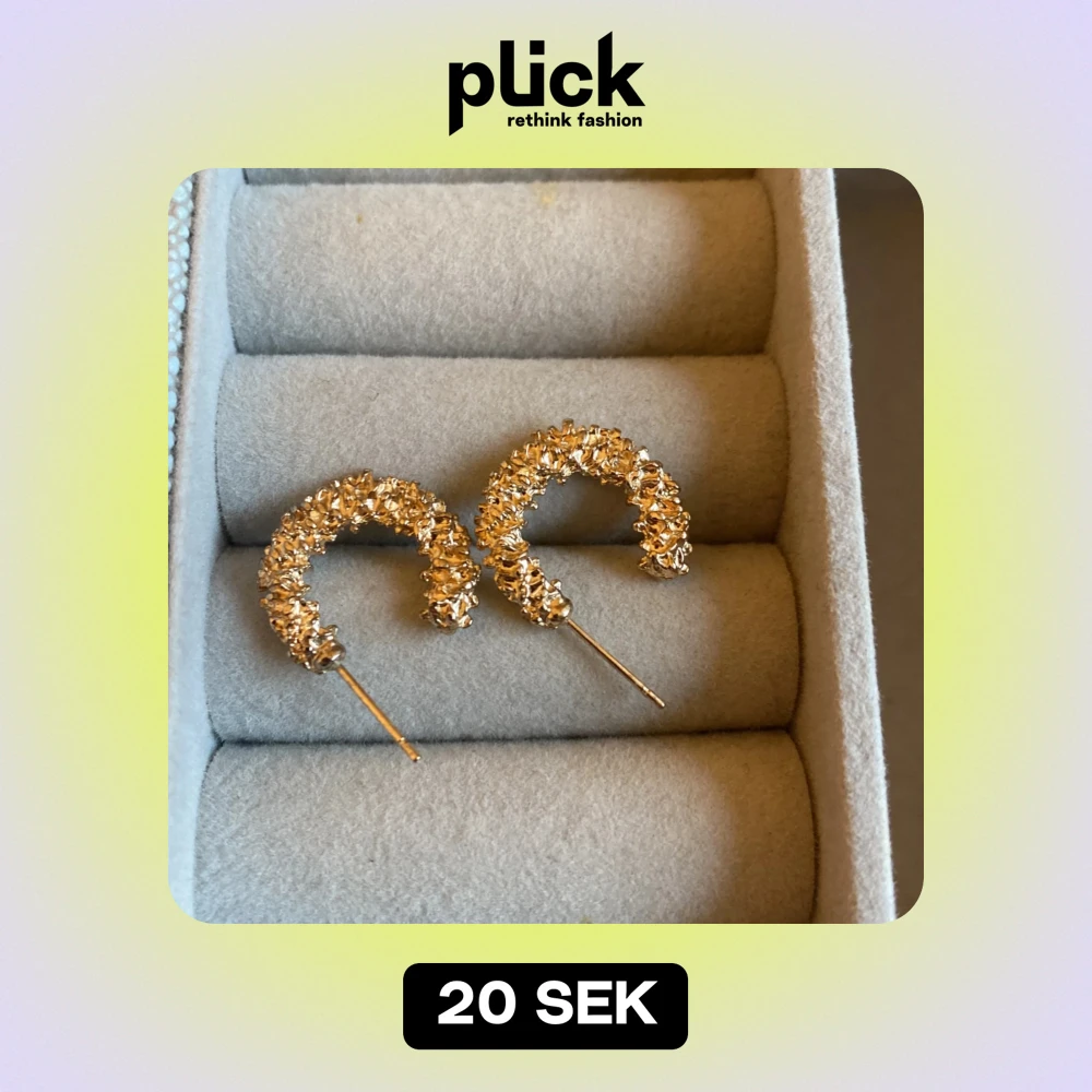Säljer ett par fantastiska guldglittriga örhängen i form av halvcirklar. De är täckta med små glittrande detaljer som ger en lyxig känsla. Perfekta för att lysa upp vilken outfit som helst, oavsett om det är till fest eller vardag. Passar perfekt för jul och nyår!