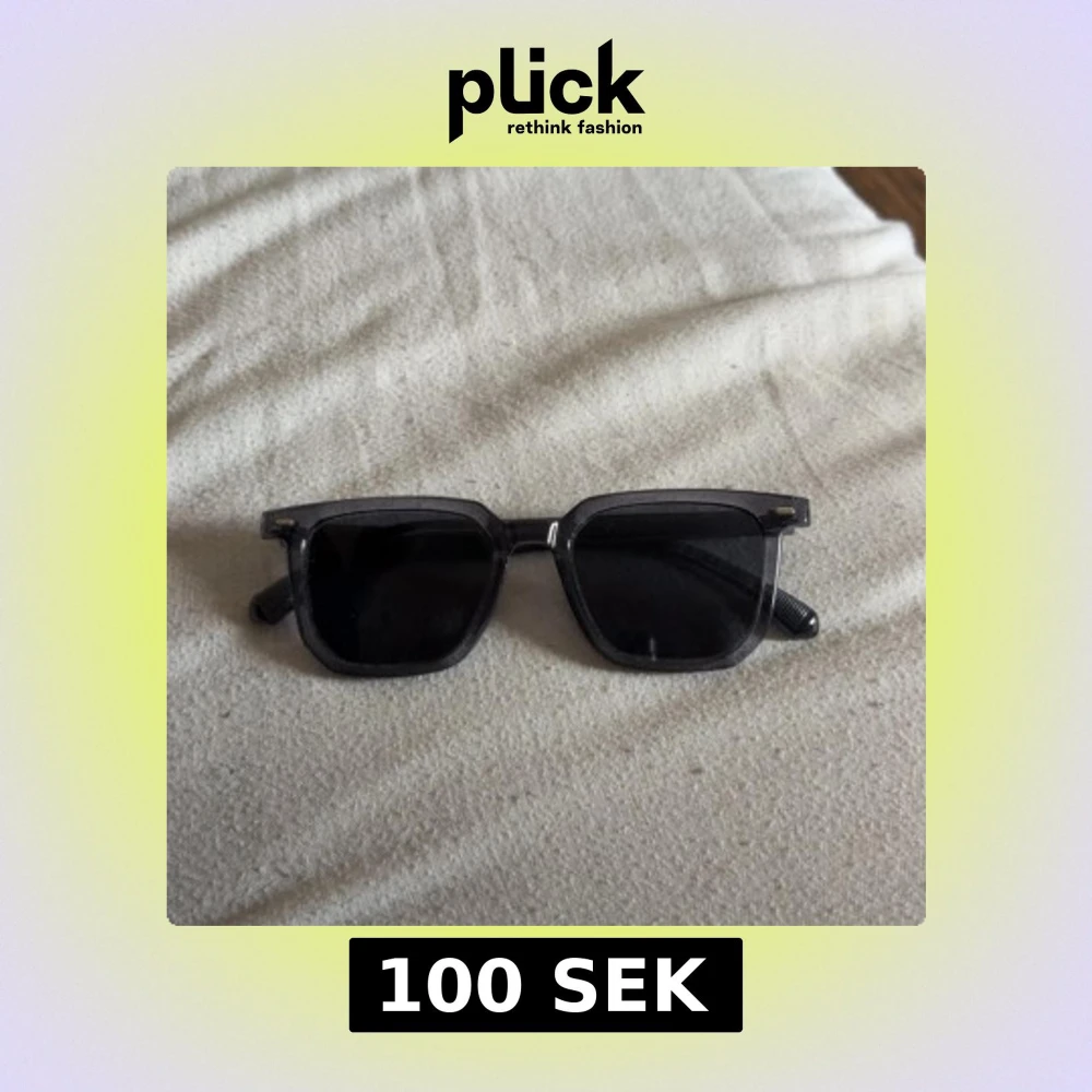 Snygga solglasögon med svart, transparent båge och mörka glas. Modellen har en fyrkantig form och passar perfekt för dig som vill ha en stilren accessoar. Bågarna är i plast och har en modern känsla. Skick 10/10!