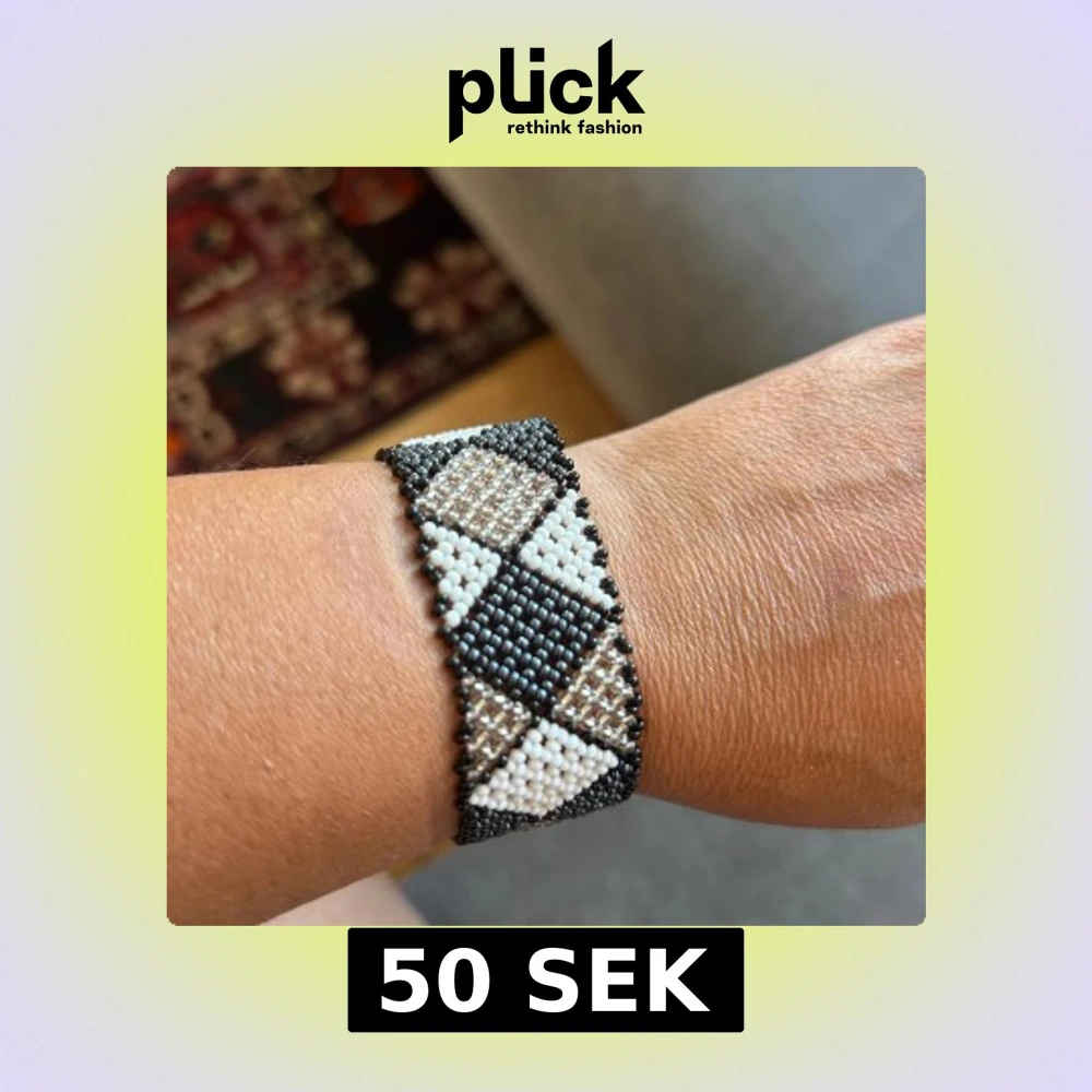 Unikt armband gjort av små pärlor i svart, vitt och silver. Armbandet har ett rutigt mönster med geometriska former och stängs med en pärlögla. Perfekt accessoar för dig som gillar detaljer och vill sticka ut lite extra.