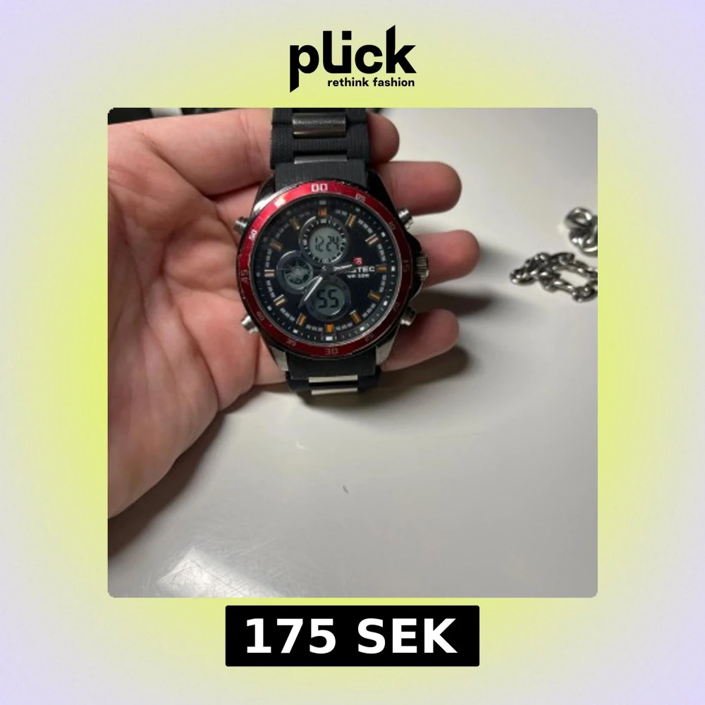 Säljer en sportig digital klocka från S-Sport med svart armband och röd bezel. Klockan har en digital display med flera funktioner och en robust design. Perfekt för den som gillar en aktiv livsstil.