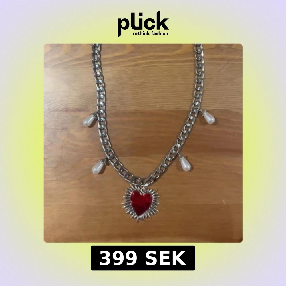 Unikt halsband med en tjock silverkedja och ett stort rött hjärta i mitten. Halsbandet har även fyra droppformade pärlor som hänger längs kedjan. Perfekt för att ge en edgy touch till din outfit.