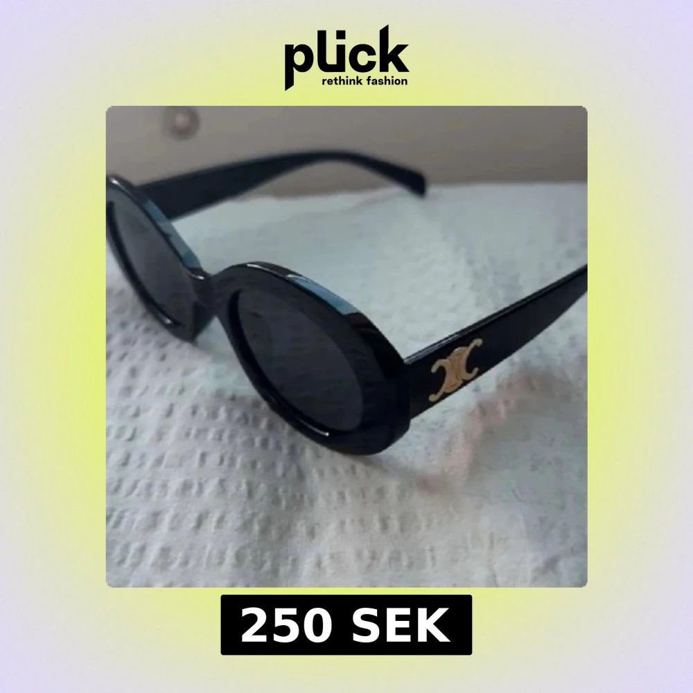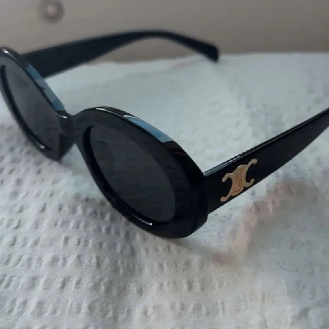 Snygga svarta solglasögon med rundade bågar och guldigt logodetalj på sidorna. Glasögonen är tillverkade i blankt syntetmaterial. Fodral ingår ej💕.