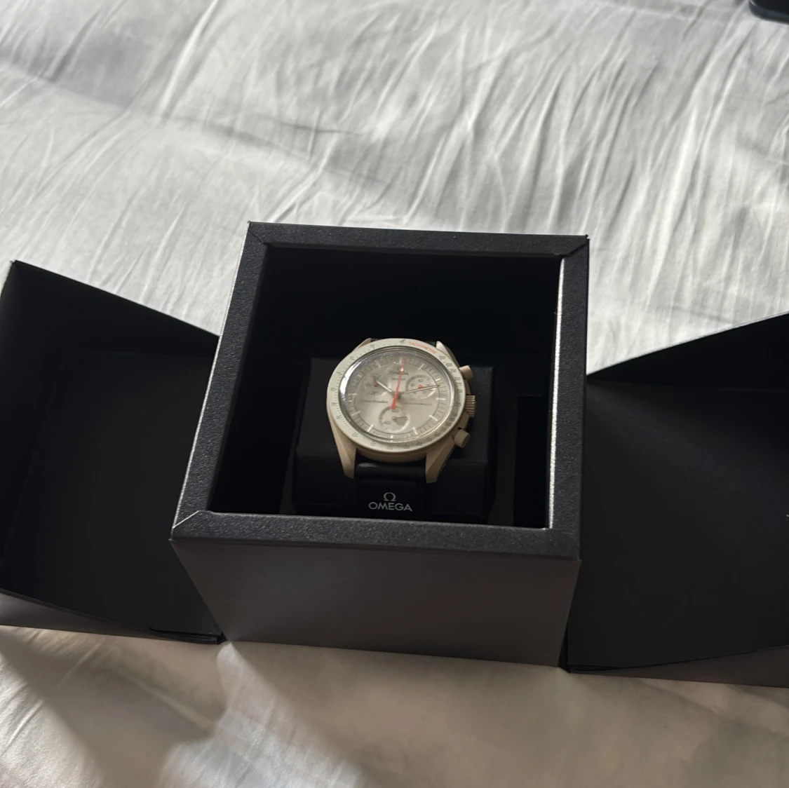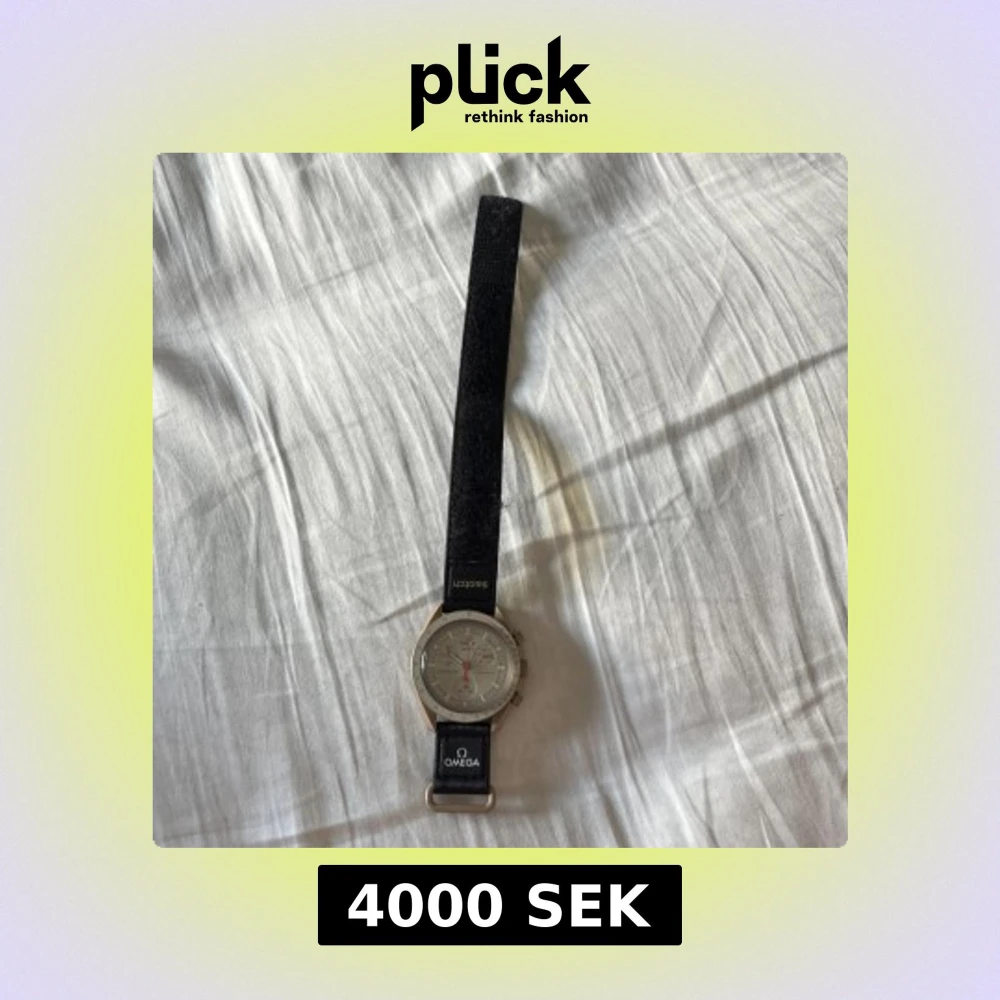 Säljer en Omega x Swatch Speedmaster med svart band och silverfärgat ur. Klockan har en rund boett, kronograf och detaljer i rött på urtavlan. Bandet är i syntetmaterial med Omega och Swatch-logga. Perfekt för dig som gillar stilrena och ikoniska accessoarer.