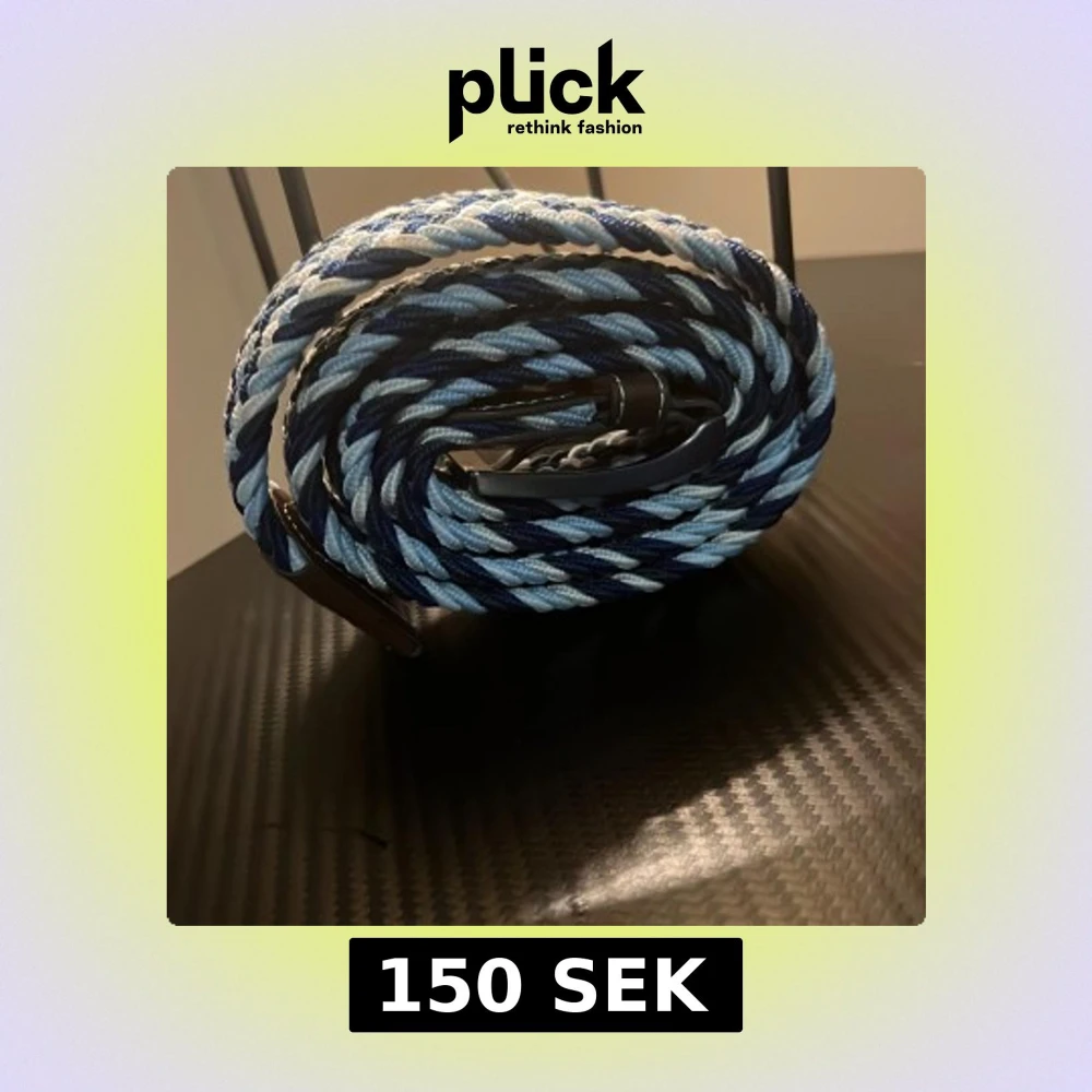 Säljer ett snyggt flätat bälte med randigt mönster i marinblått, ljusblått och vitt. Bältet har detaljer i brunt skinn vid spännet och en klassisk metallspänne. Perfekt accessoar för att lyfta din outfit med lite färg och stil.