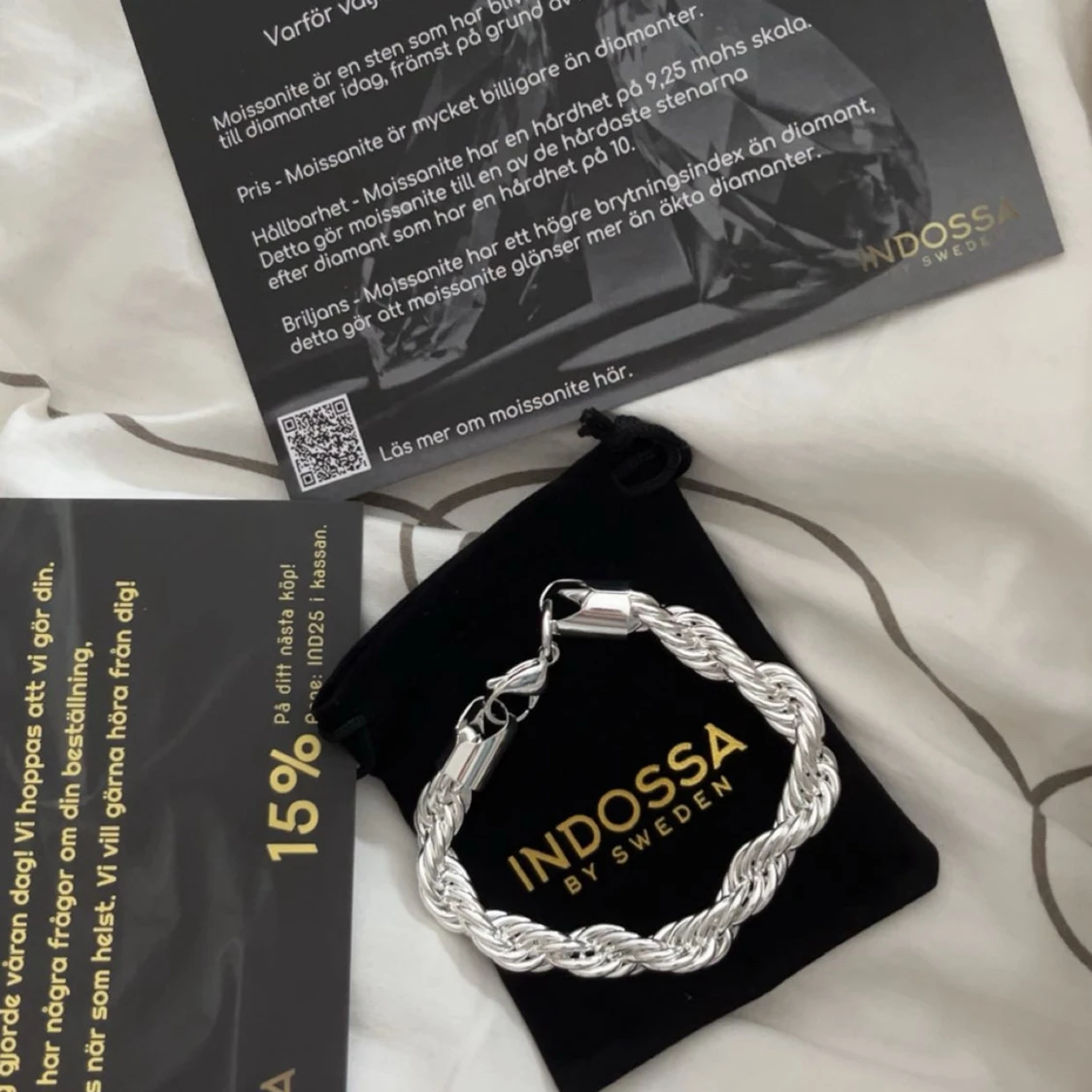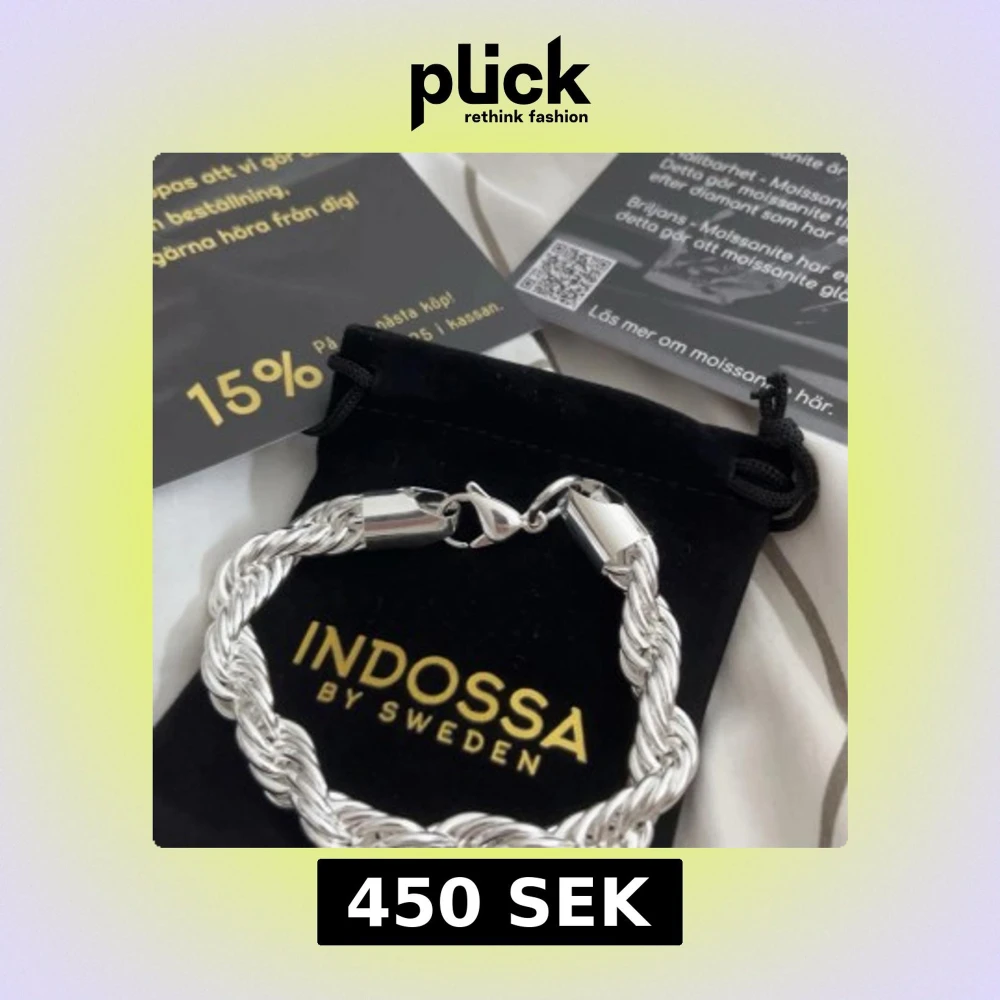 Snyggt armband i flätad design från Indossa by Sweden. Armbandet är silverfärgat med en robust och glansig finish, och har ett rejält lås som gör det enkelt att ta på och av. Perfekt accessoar för att lyfta din stil. Pris går att diskuteras, 21cm långt, 10mm kedja