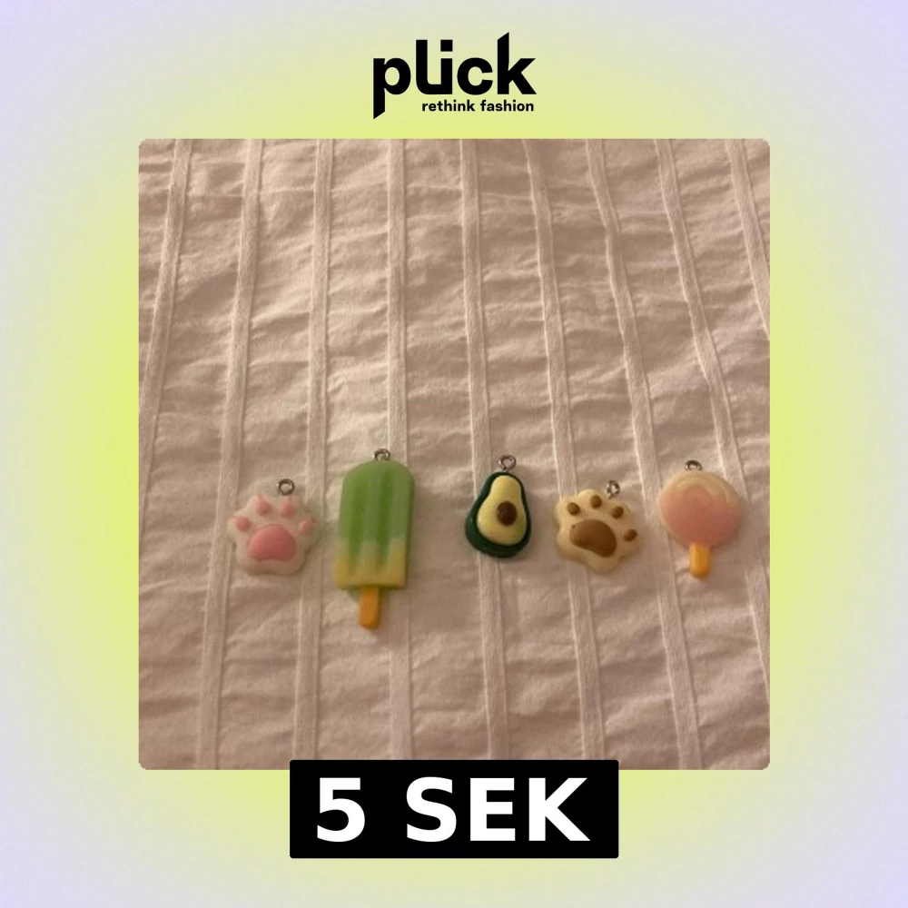 Fem färgglada berlocker i form av tassar, glass, avokado och klubba. Perfekta att använda som hängen till halsband eller armband. Mix av pastellfärger som rosa, grön, gul, brun och vit. Tillverkade i syntetmaterial med lekfull design.🍬✨✨Tyvärr har den rosa tassen lite rosa fläckar på sig.