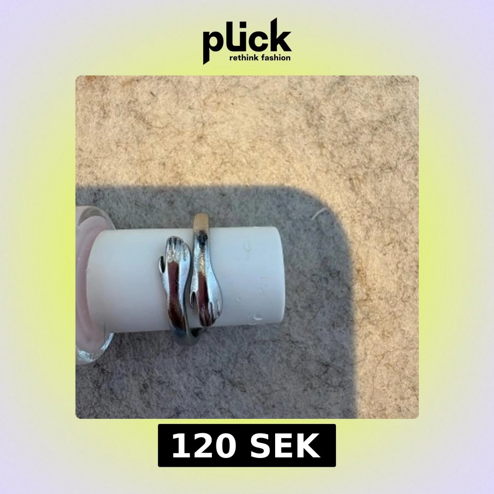 Unik silvrig ring med cool design där ändarna är formade som små händer. Ringen har en slät yta och är gjord i metall med blank finish. Perfekt för dig som gillar annorlunda och kreativa smycken som sticker ut.