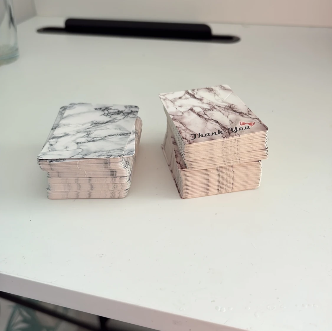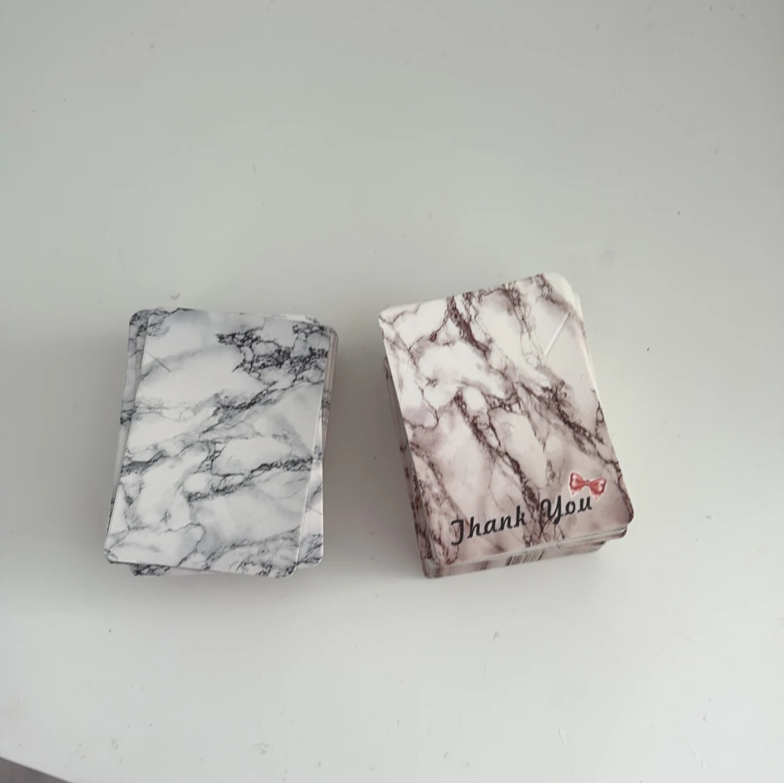Två displayer med snyggt marmormönster, en med texten 'Thank You' och en utan text.