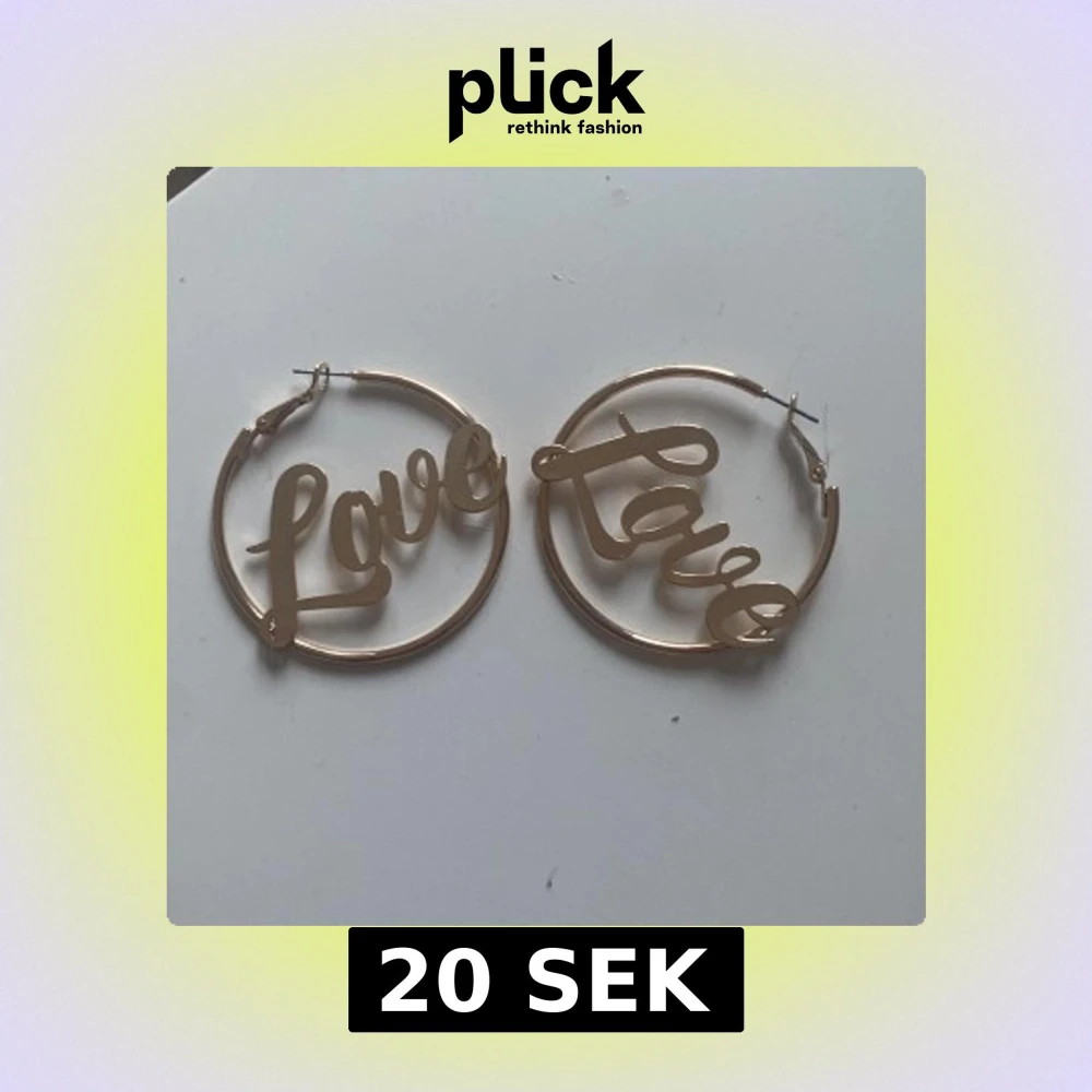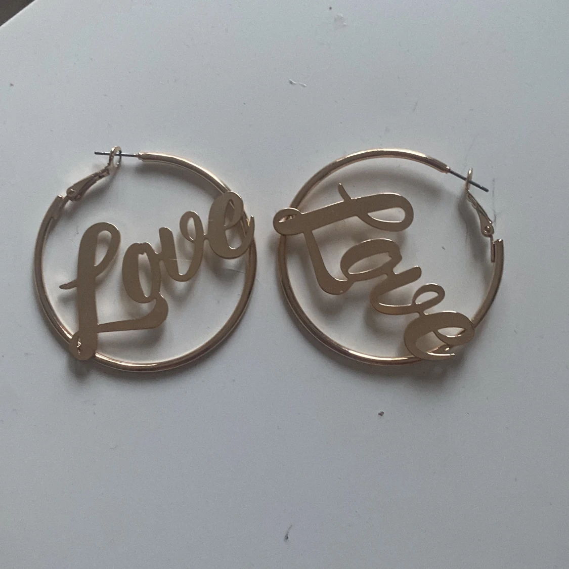 Säljer ett par stora hoop-örhängen i guld med cool textdesign där det står 'Love' i varje ring.