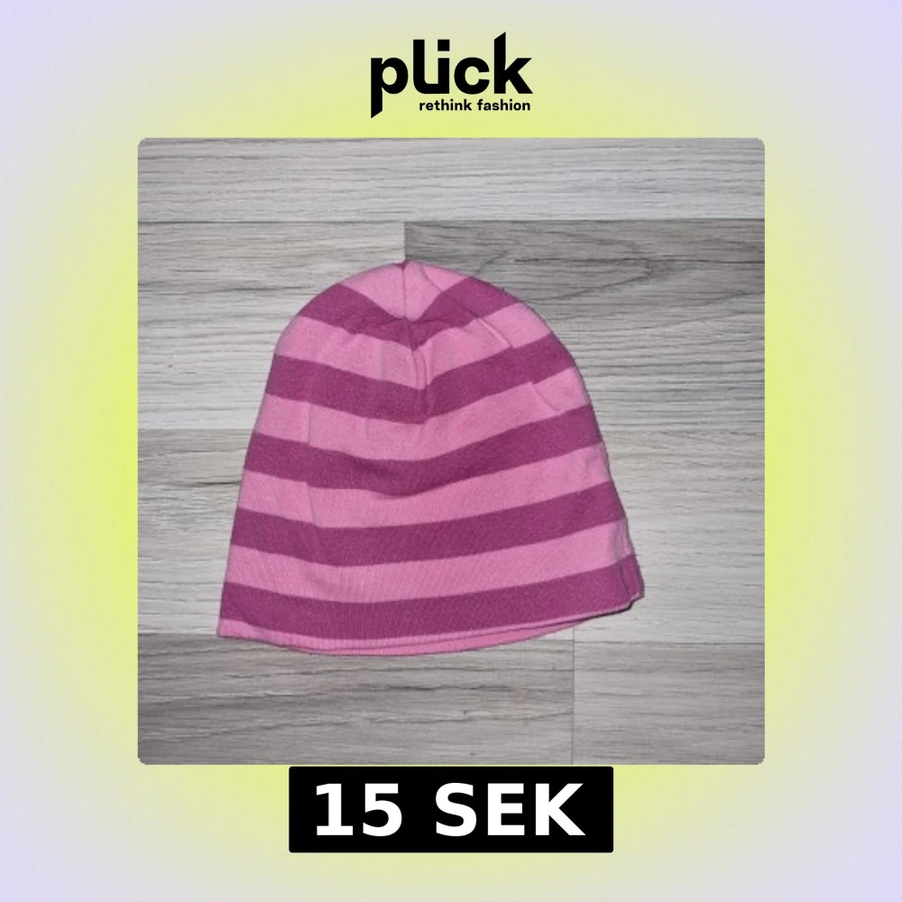 Snygg och färgglad mössa i rosa och lila med breda ränder. Perfekt för att hålla värmen under kyliga dagar. Den är mjuk och bekväm att bära.