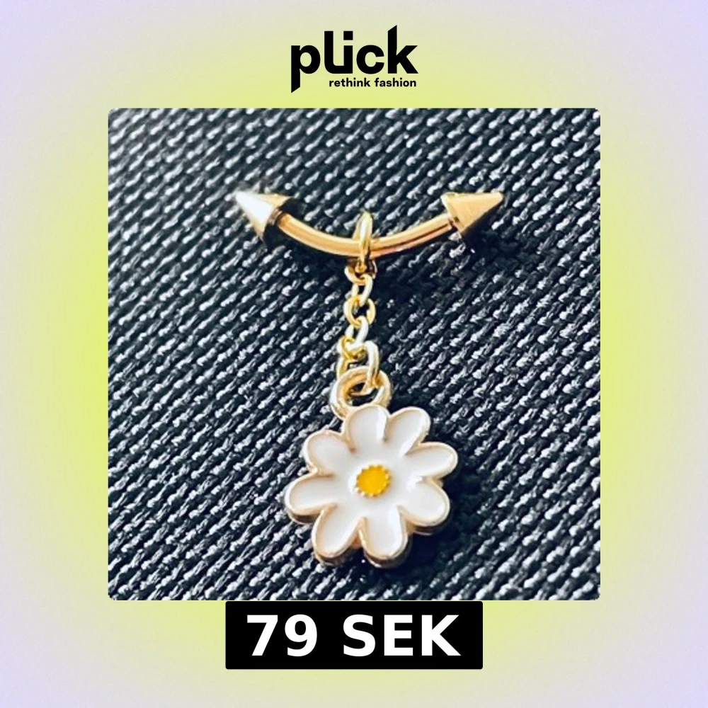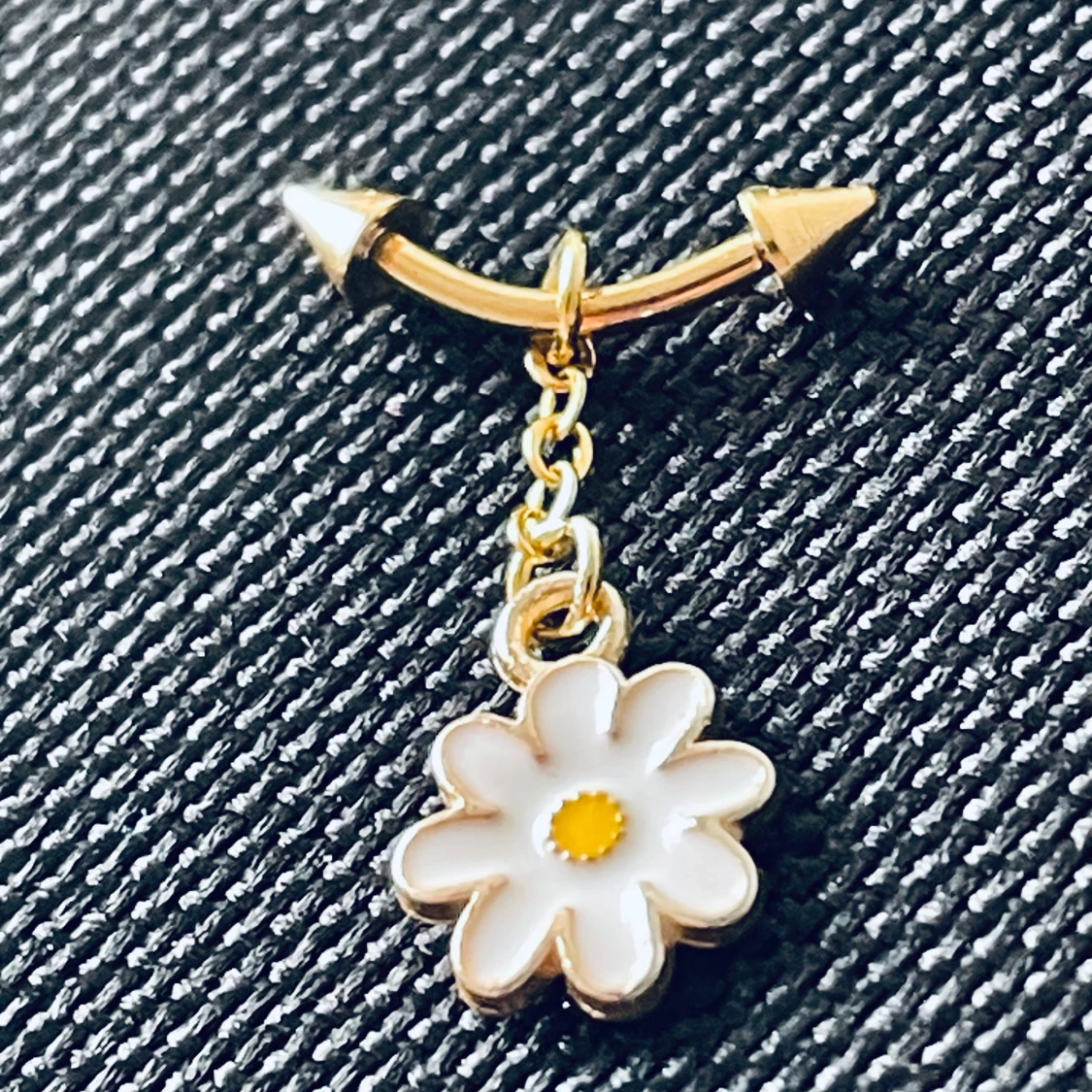 Snygg navelpiercing i guldpläterad metall med en hängande mini vit blomma och gul detalj i mitten. Perfekt för dig som vill ha en söt och unik detalj till din look.
