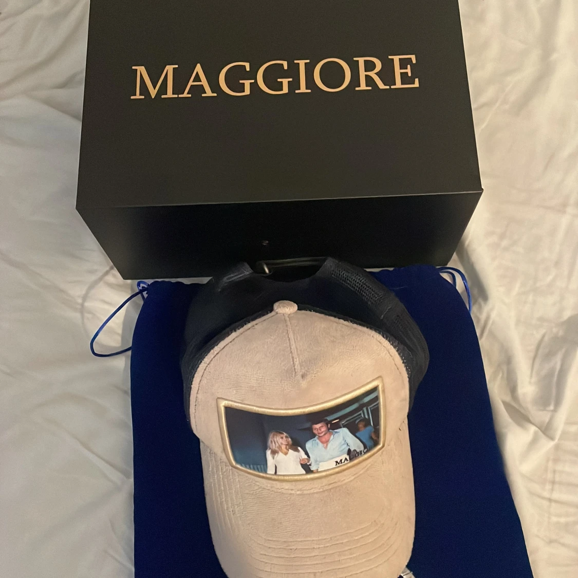 Unik keps från Maggiore med beige front i plyschliknande material och svart mesh baktill. Framsidan har en inramad bild med motiv av två personer. Justerbar passform och cool kontrast mellan material och färger. Perfekt statement-piece för dig som vill sticka ut.