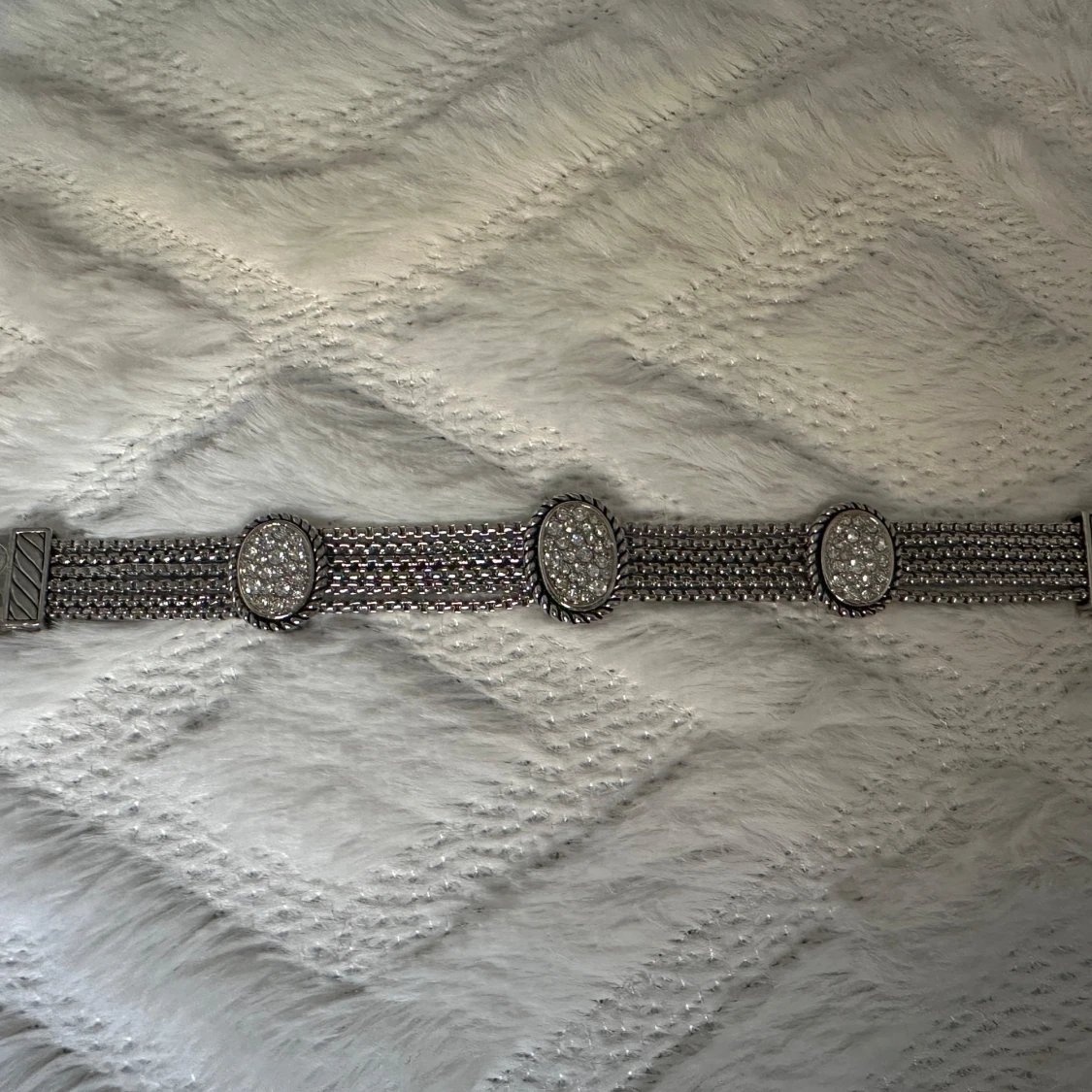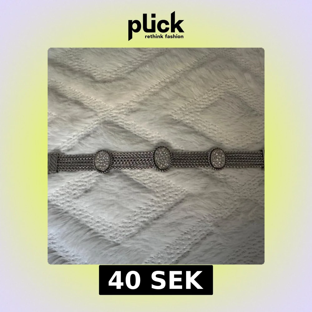 Säljer ett riktigt snyggt armband i silverfärgad metall med flera kedjor och ovala spännen dekorerade med glittrande stenar. Armbandet har en cool och unik design som verkligen sticker ut och passar perfekt om du vill addera lite extra bling till din outfit.