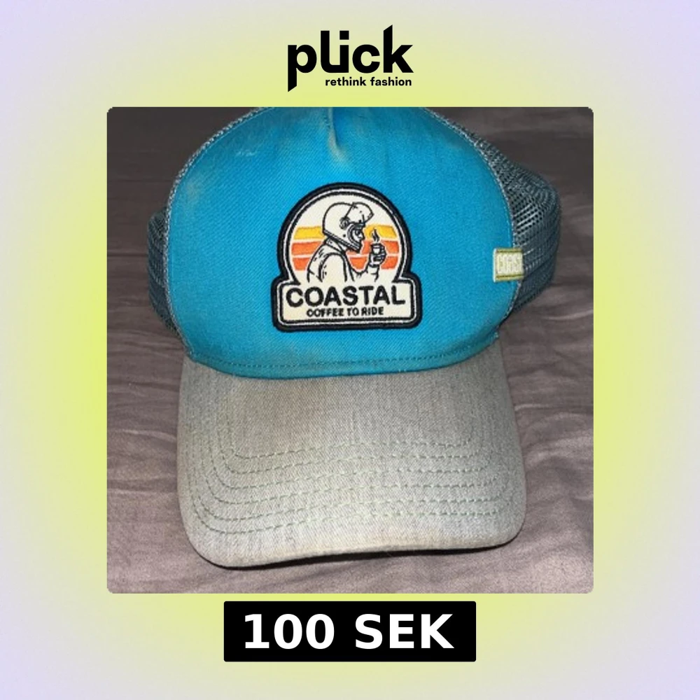Snygg turkos keps från Coastal med grå skärm, mesh baktill och justerbar grön snapback. Framtill sitter en broderad patch med en hjälmklädd figur och texten 'COASTAL Coffee to Ride' i retrostil med orange och gula detaljer.