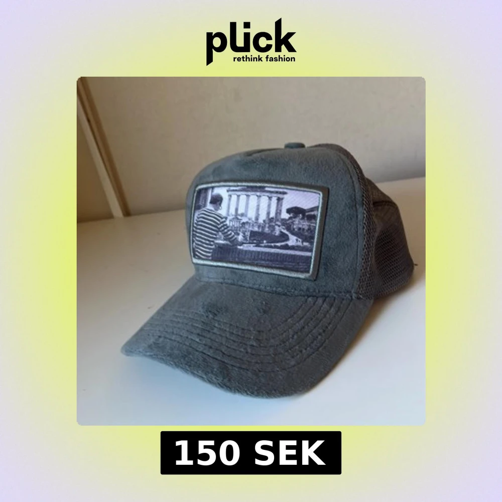Snygg grå keps med mjuk mockaliknande front och mesh på sidorna och bak. Framtill sitter en patch med svartvitt foto av en person i randig tröja framför klassiska pelare. Perfekt för dig som gillar unik streetstyle. Det är dessvärre vit färg på insidan av kepsen som inte syns.