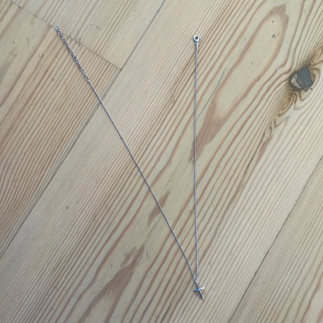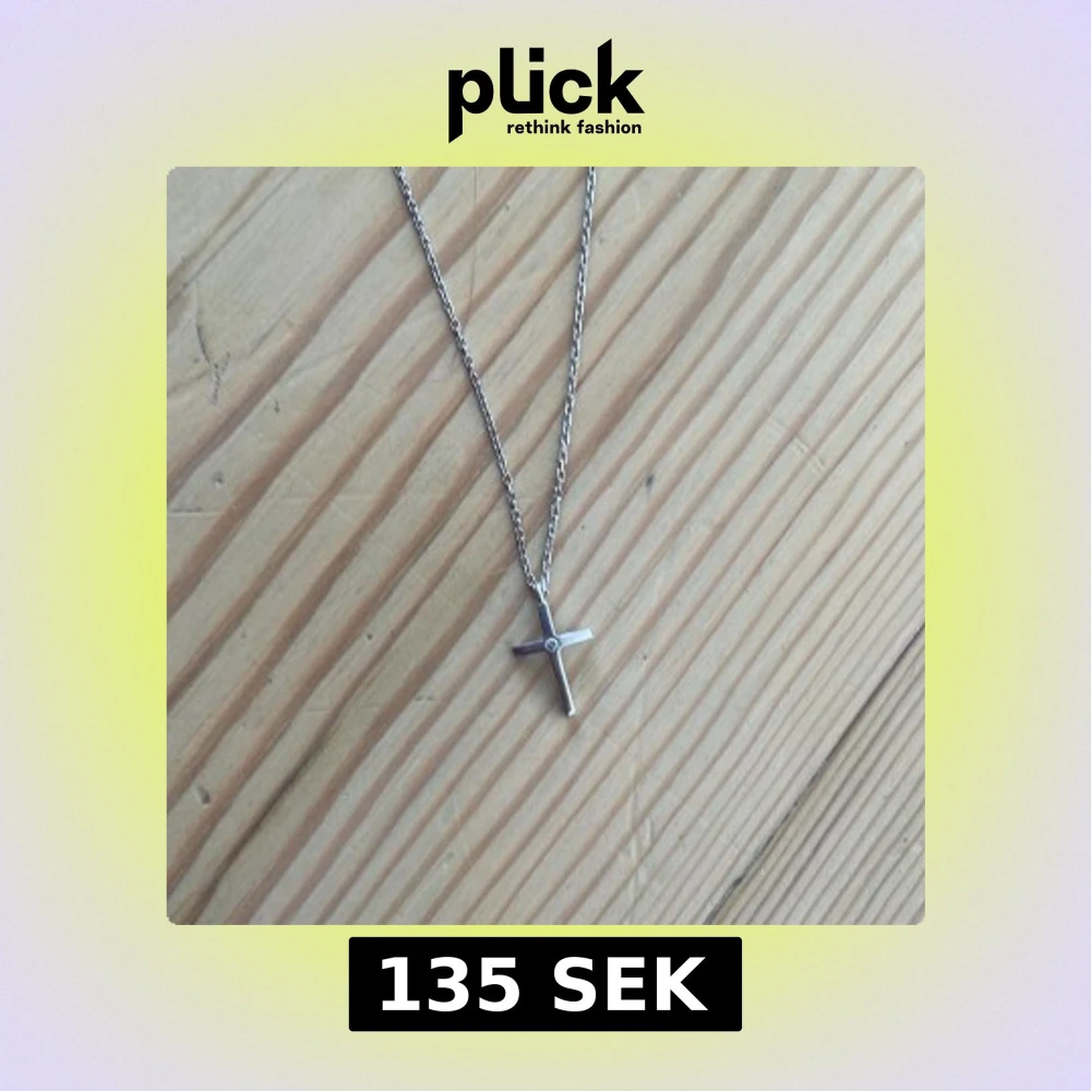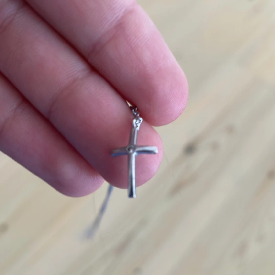 Stilrent halsband i silverfärg med en tunn kedja och ett kors som hänge. Korset har en liten detalj i mitten som ger extra karaktär. Perfekt för dig som gillar minimalistiska smycken med en klassisk touch.