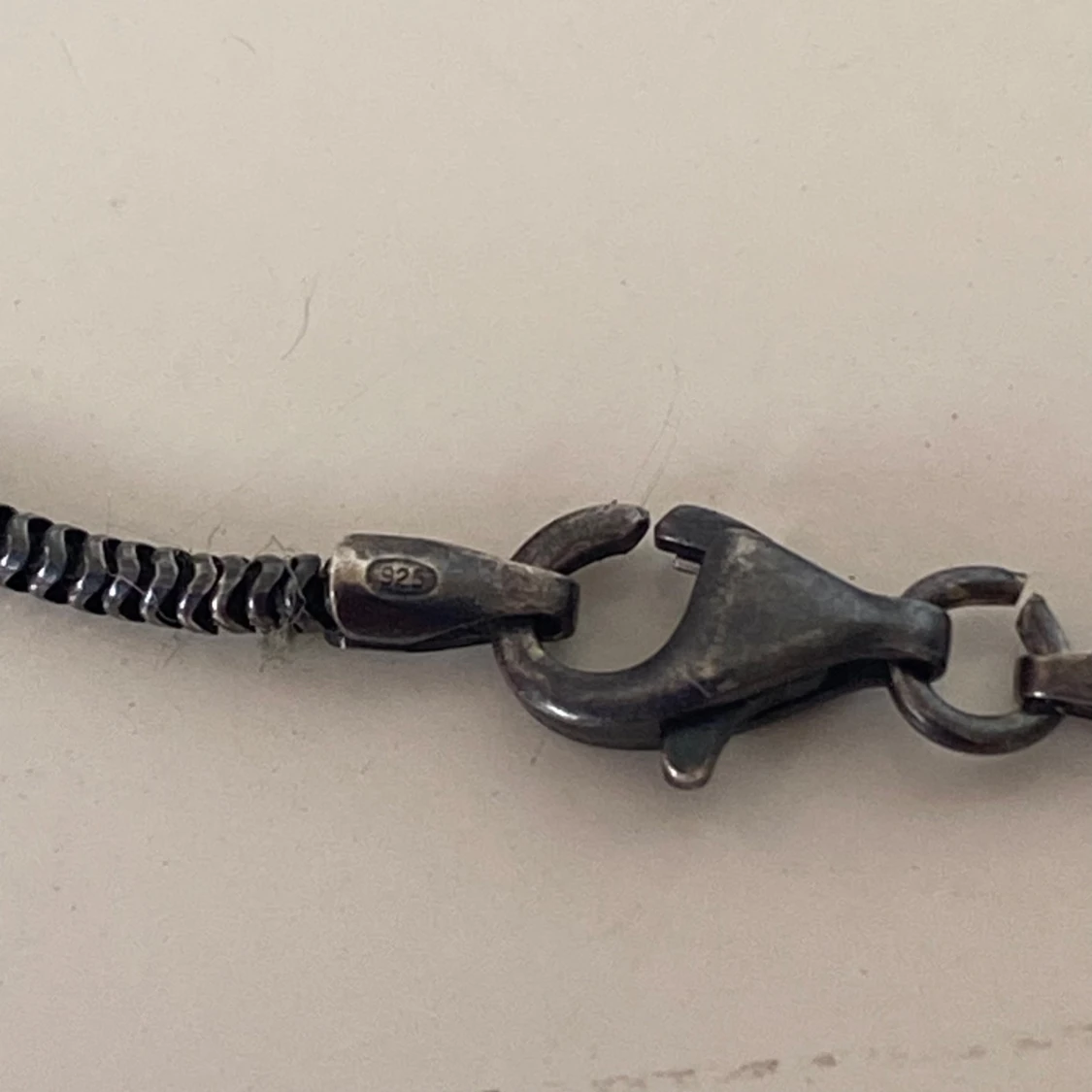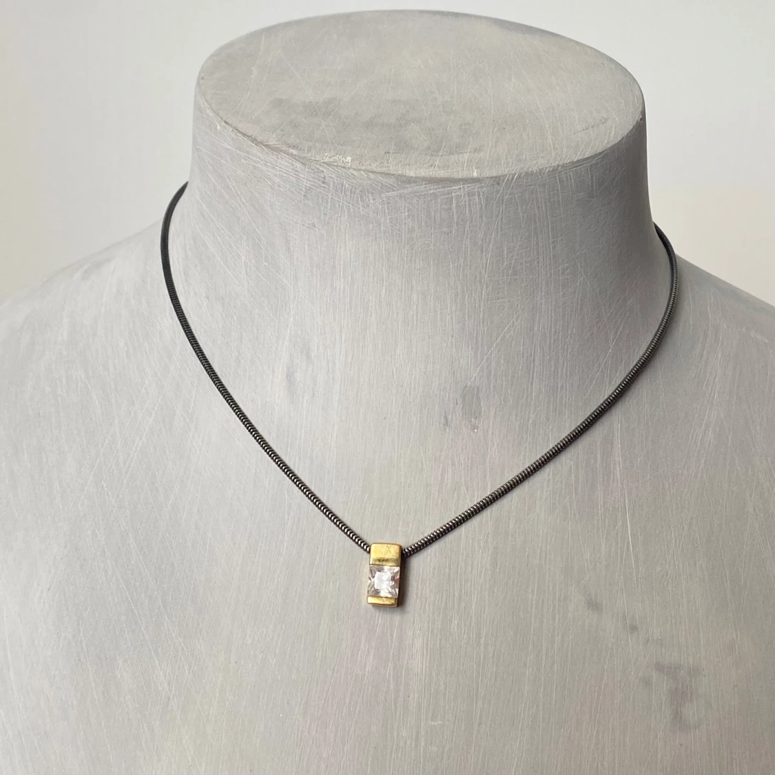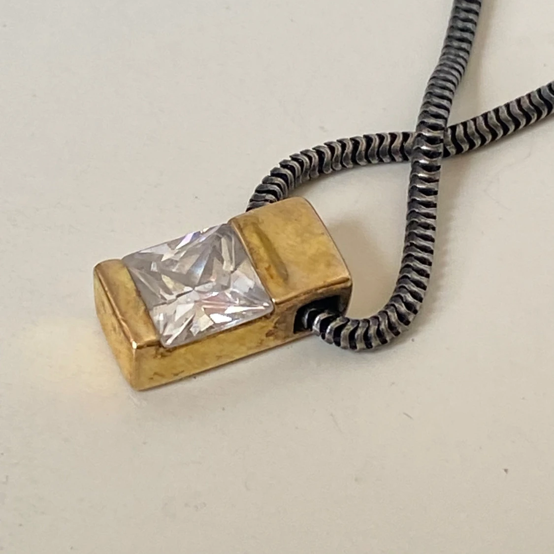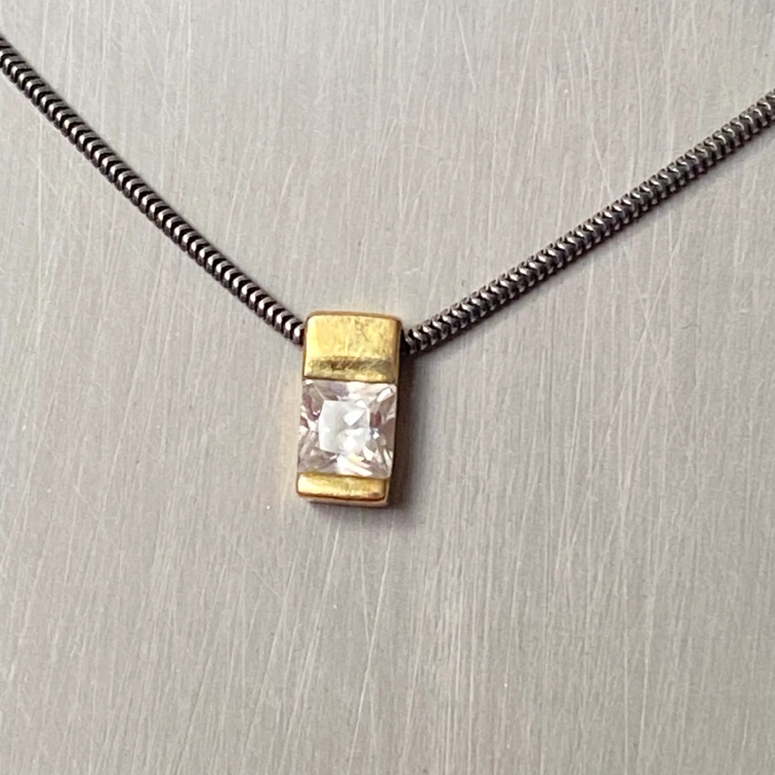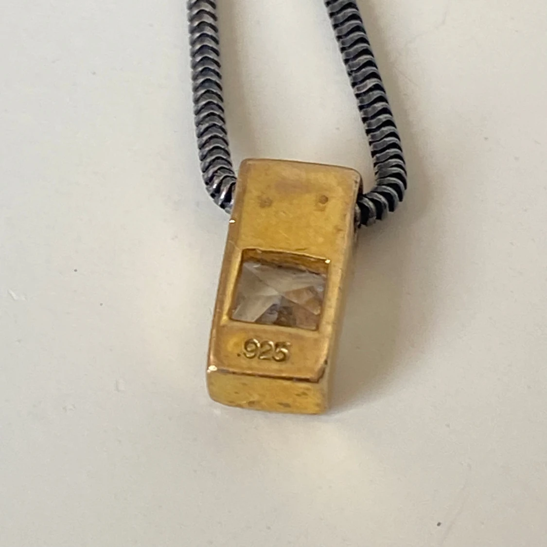 Snyggt halsband med en fyrkantig klar sten infattad i ett guldpläterat hänge. Hänget sitter på en mörk kedja i äkta silver. Märkt 925 på baksidan samt i berlock . Perfekt för dig som gillar stilrena smycken.