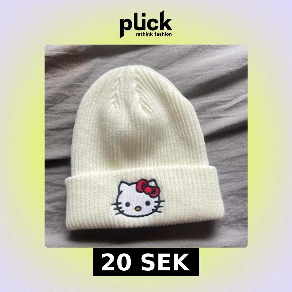 Söt vit ribbad mössa med en broderad Hello Kitty på framsidan. Perfekt för att hålla sig varm och stilren under kyliga dagar. Den har en uppvikt kant och en ikonisk röd rosett på Hello Kittys huvud.