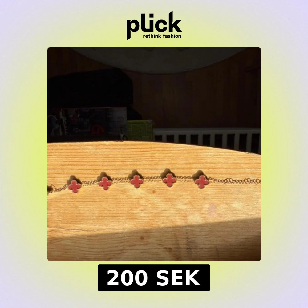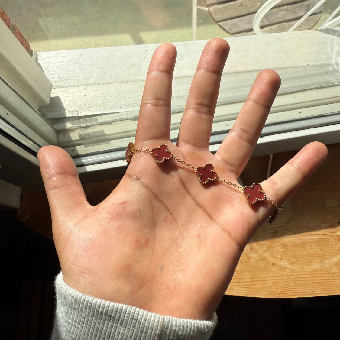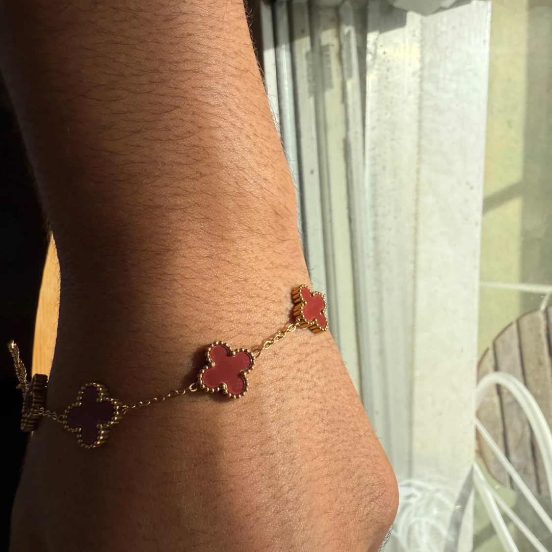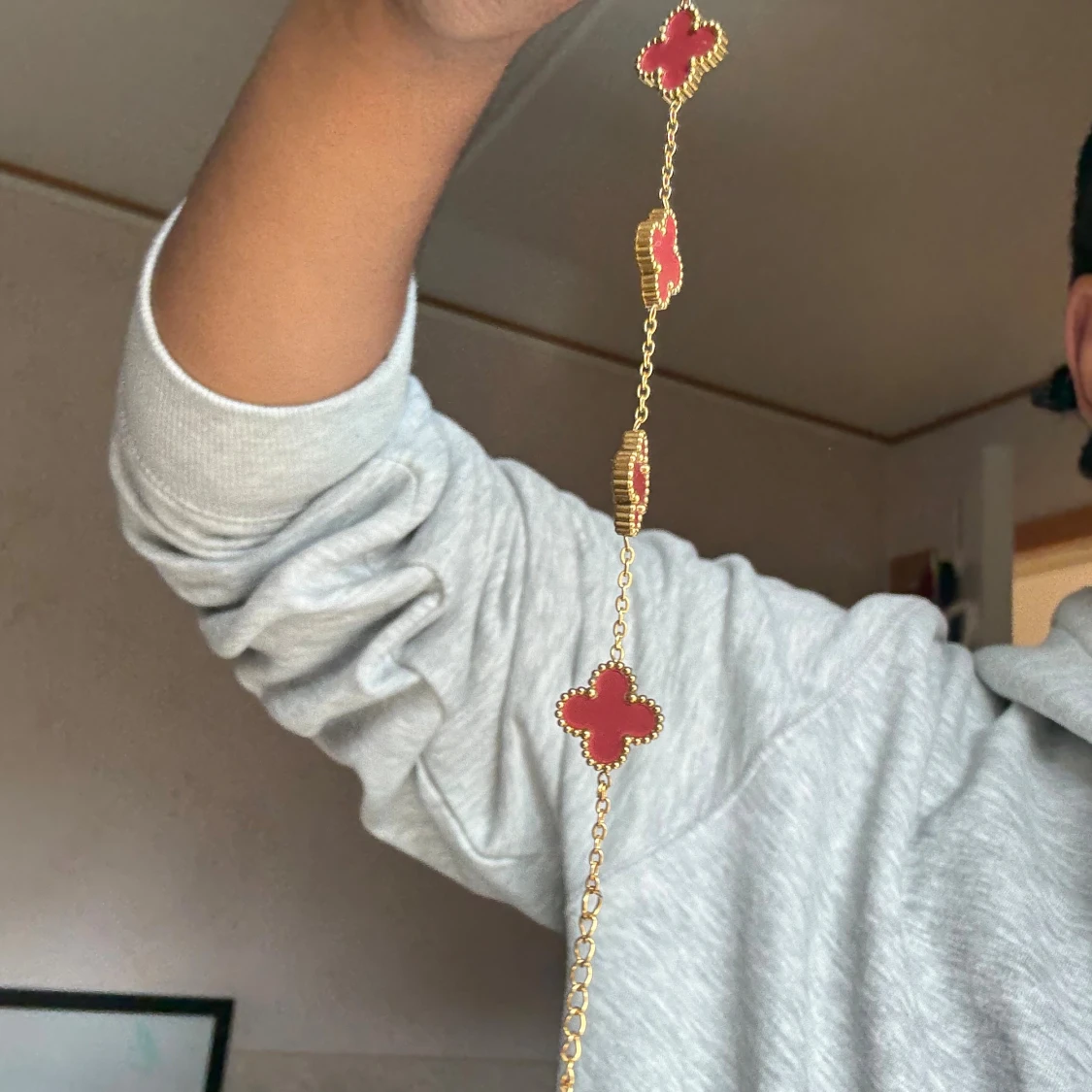 Snyggt armband med guldfärgad kedja och fem röda klöverformade berlocker. Berlockerna har en fin kantdetalj som ger extra lyxig känsla. Perfekt för dig som vill ha något unikt och färgglatt på handleden.