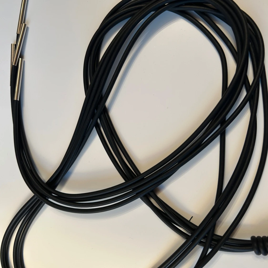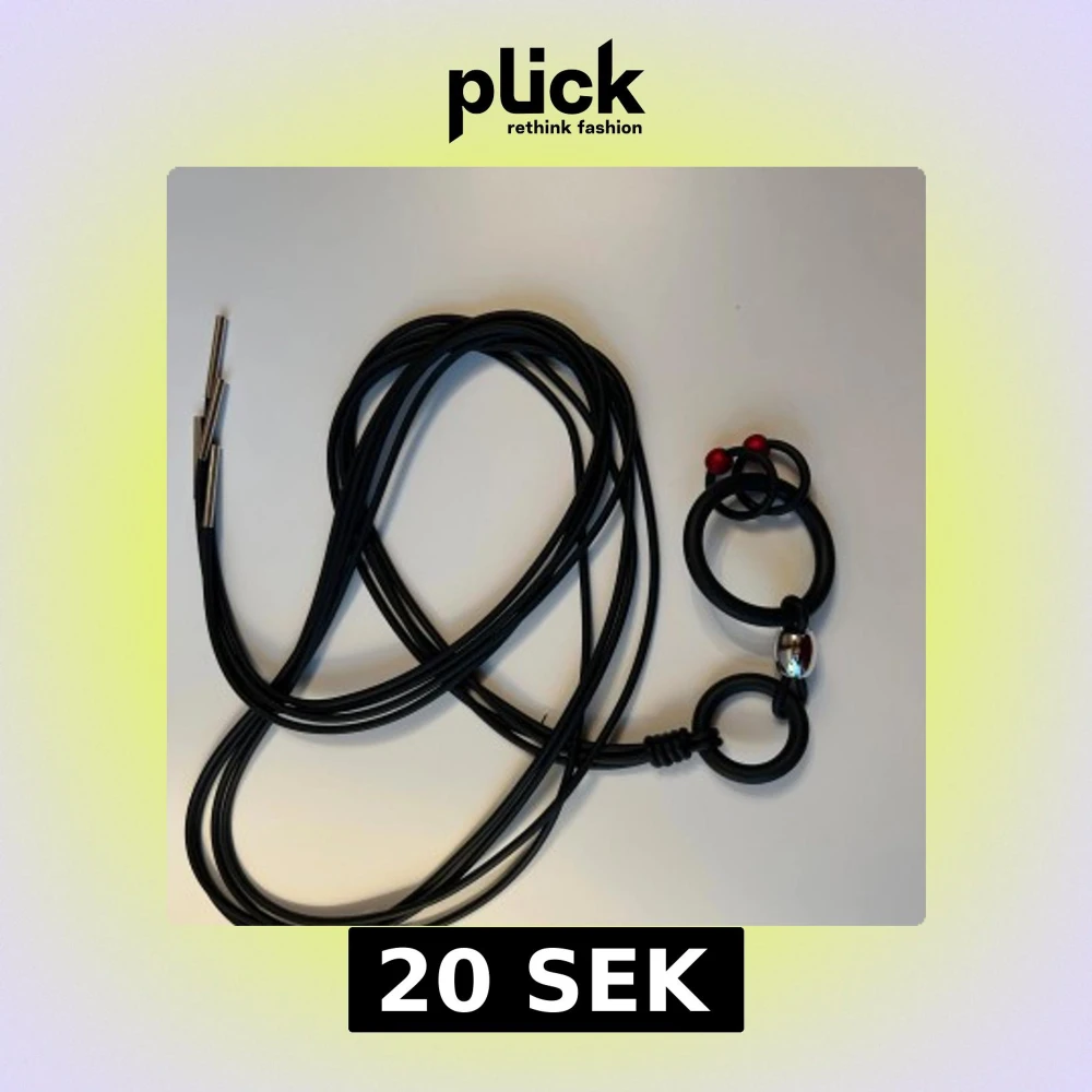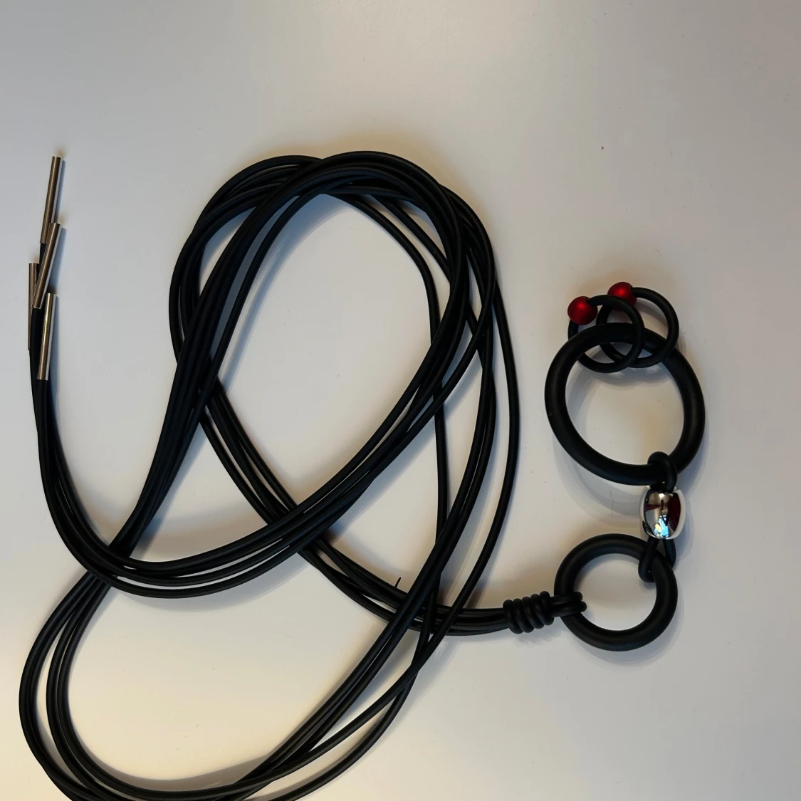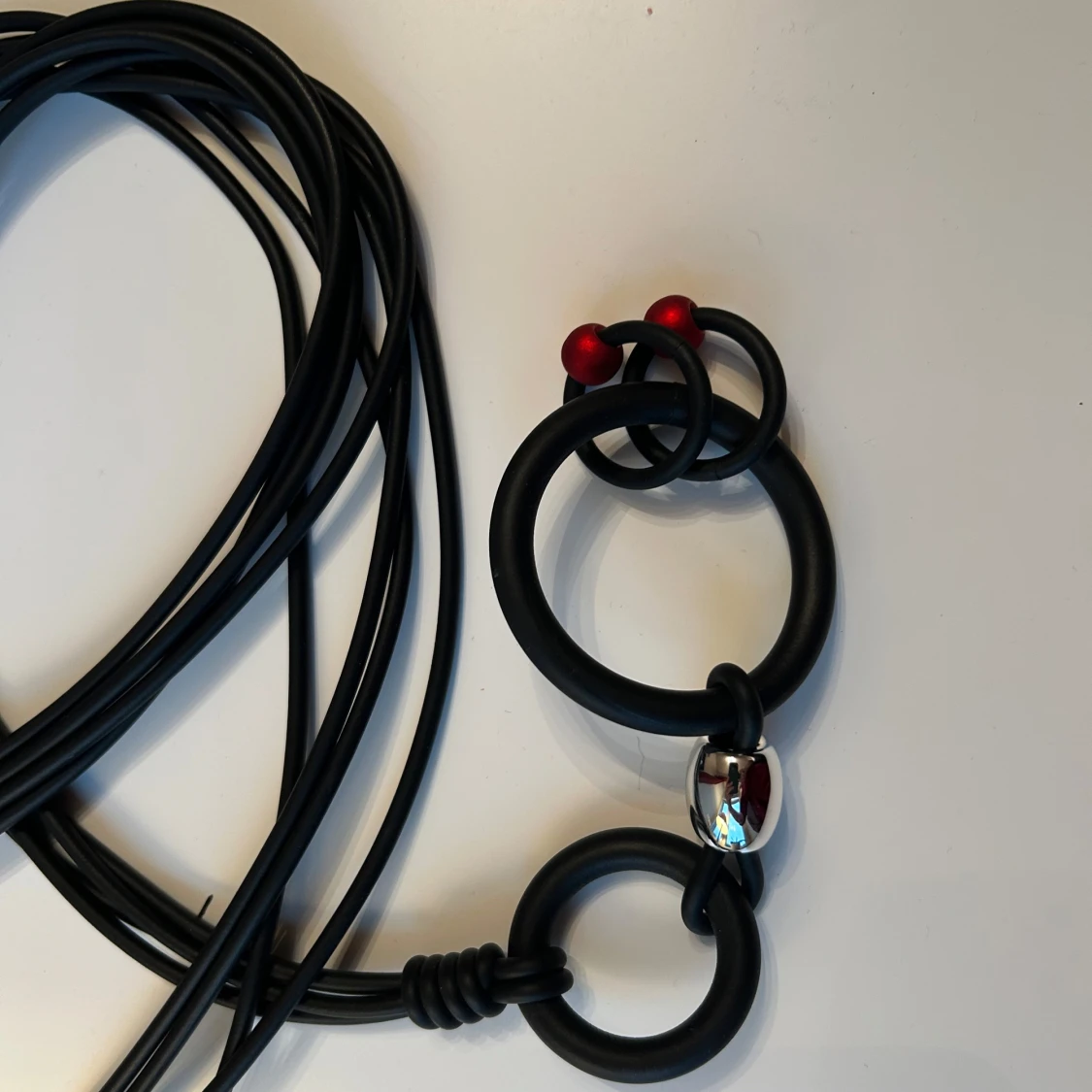 Unikt svart halsband med flera stora och små ringar i gummi, dekorerat med två röda kulor och en silverfärgad metallpärla. Långa svarta snören med metalländar ger en cool och modern vibe. Perfekt för dig som gillar statement-smycken.