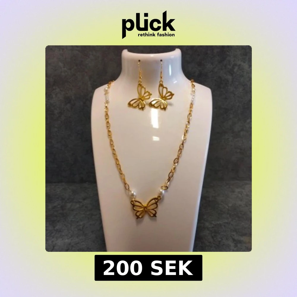 Elegant set med halsband och örhängen i guld med fjärilsmotiv. Halsbandet har en tunn kedja med små pärlor och en fjäril som hänge. Örhängena matchar med samma fjärilsdesign. Perfekt för att lägga till en touch av elegans.