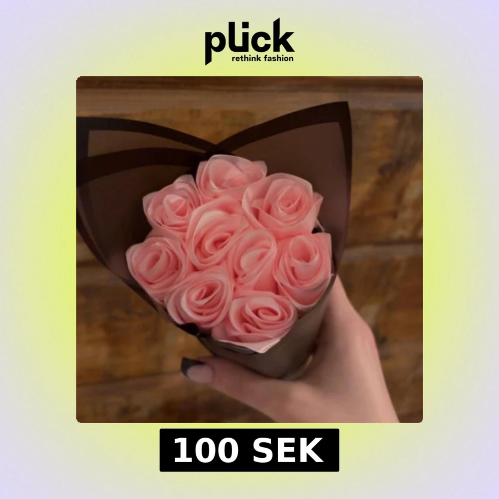 En vacker bukett med rosa rosor inslagna i ett elegant mörkt papper. Perfekt som en romantisk gest eller som dekoration i hemmet. Rosorna har en mjuk och delikat rosa färg som ger en känsla av elegans och skönhet.
