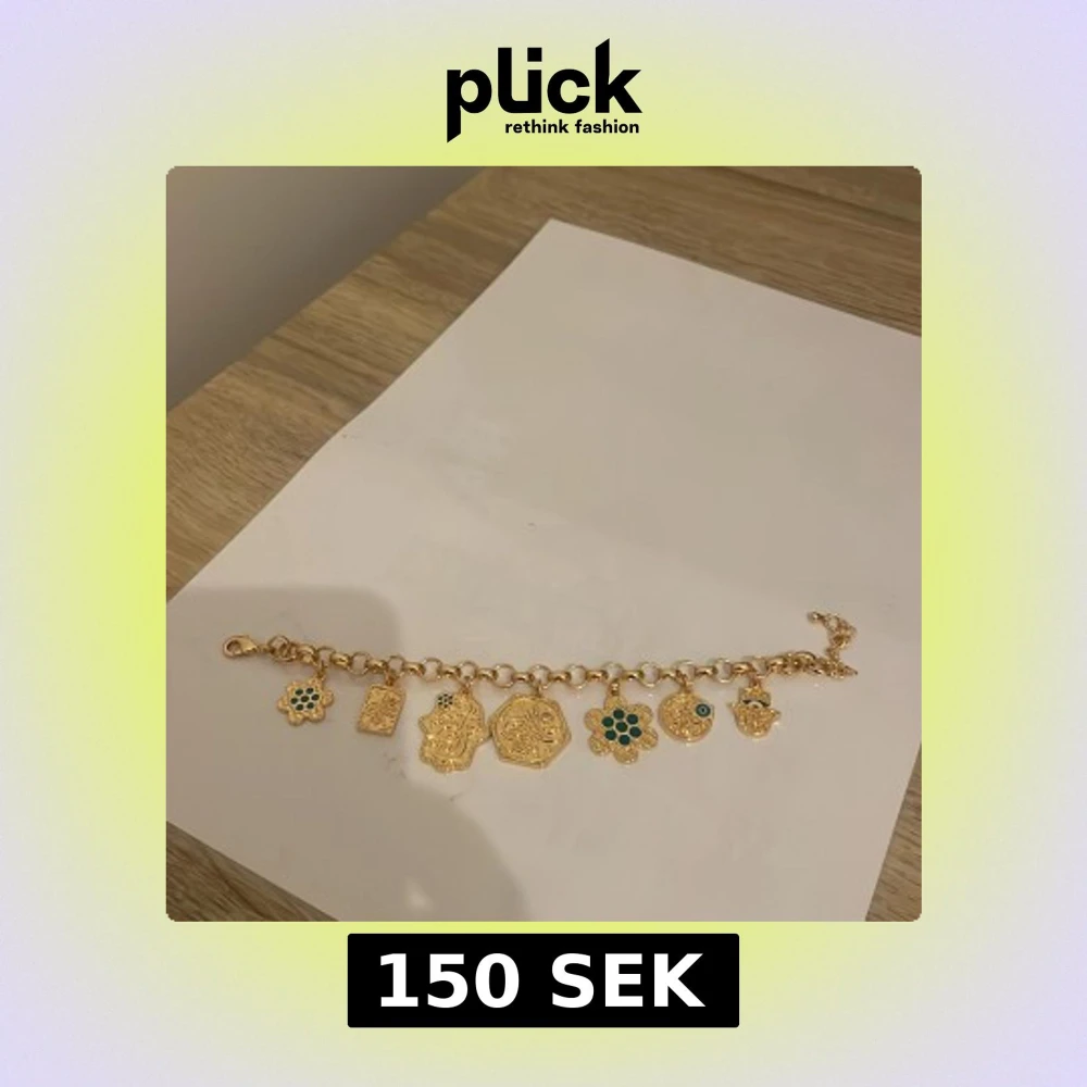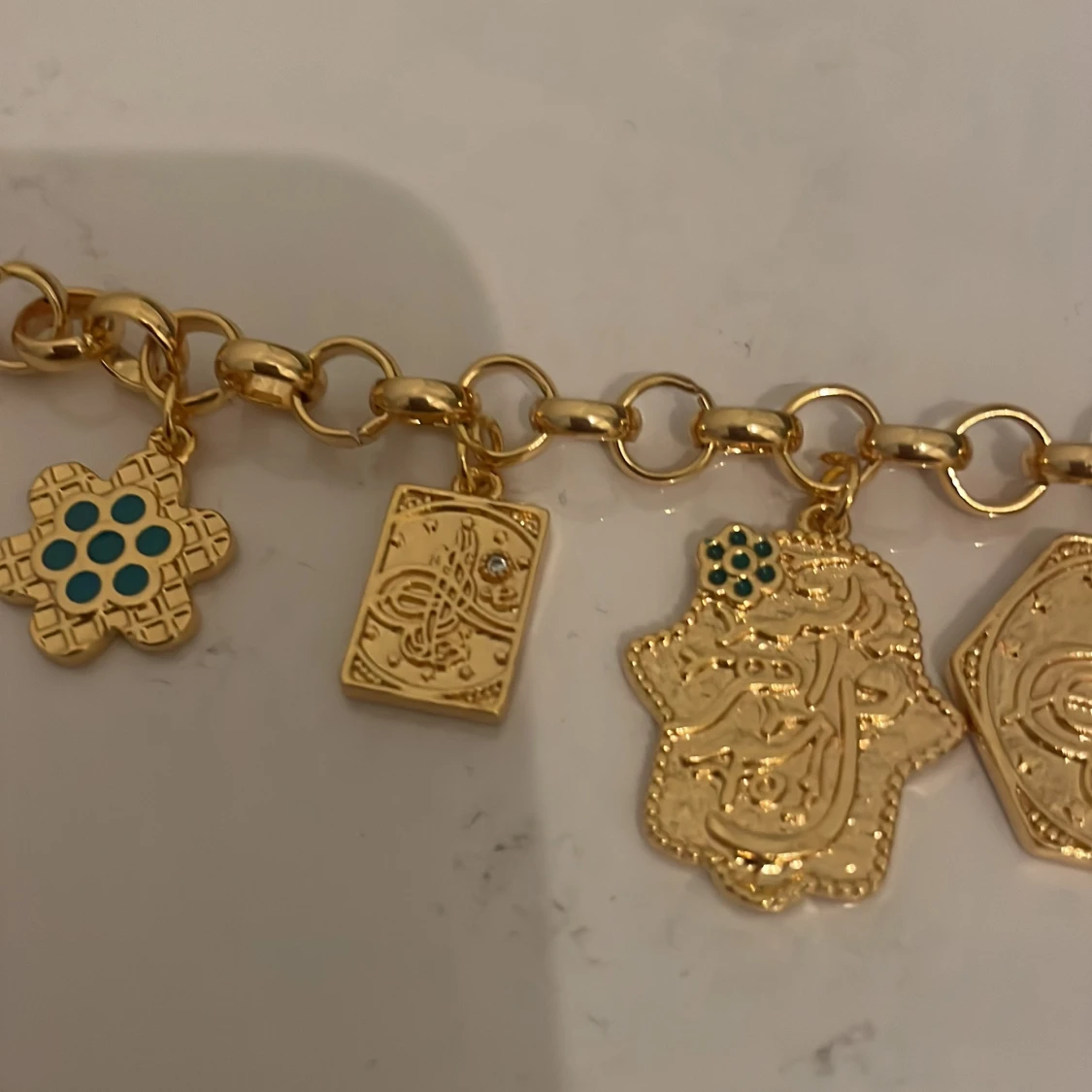 Charmigt guldarmband med flera unika berlocker, inklusive blommor och symboler med turkosa detaljer. Perfekt för att ge en personlig touch till din stil.