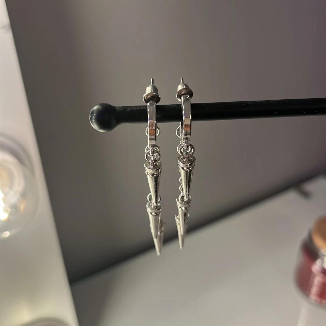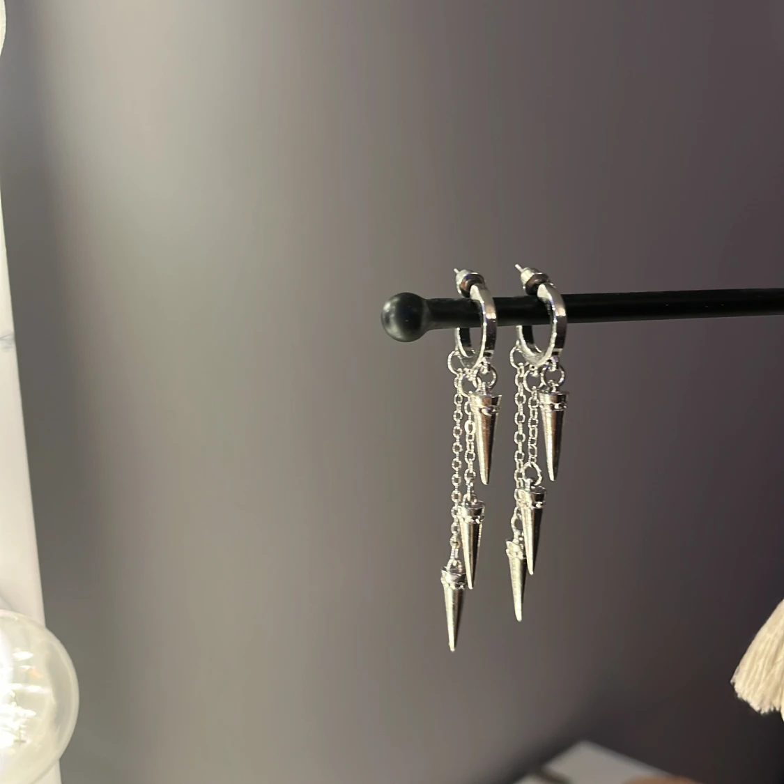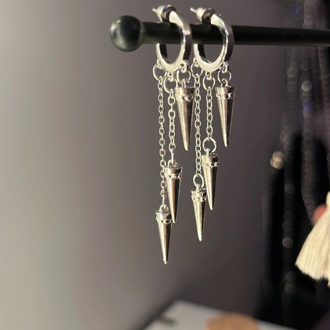 Snygga silvriga örhängen med hängande kedjor och nitar. Hör av dig om du vill köpa💕