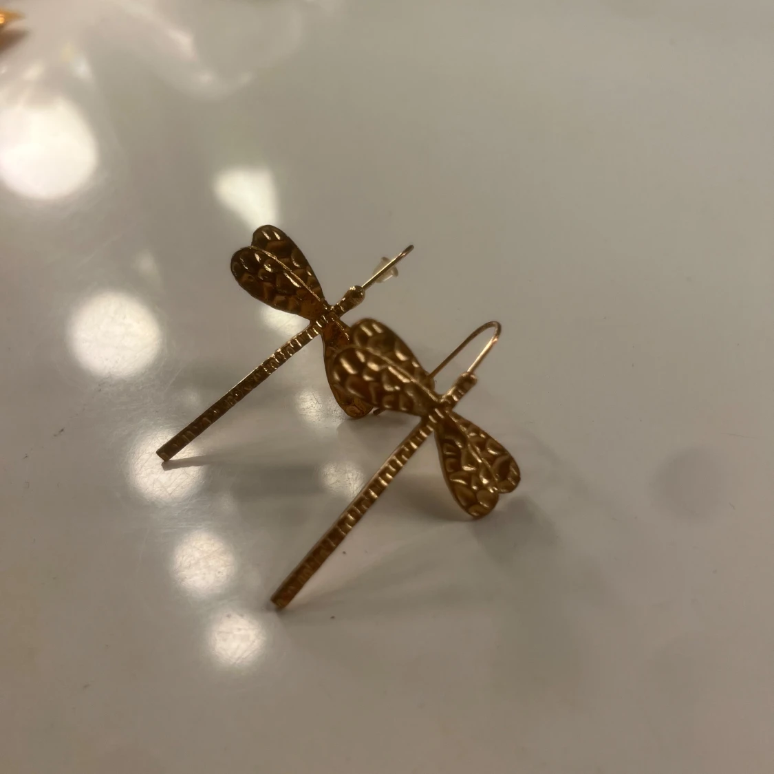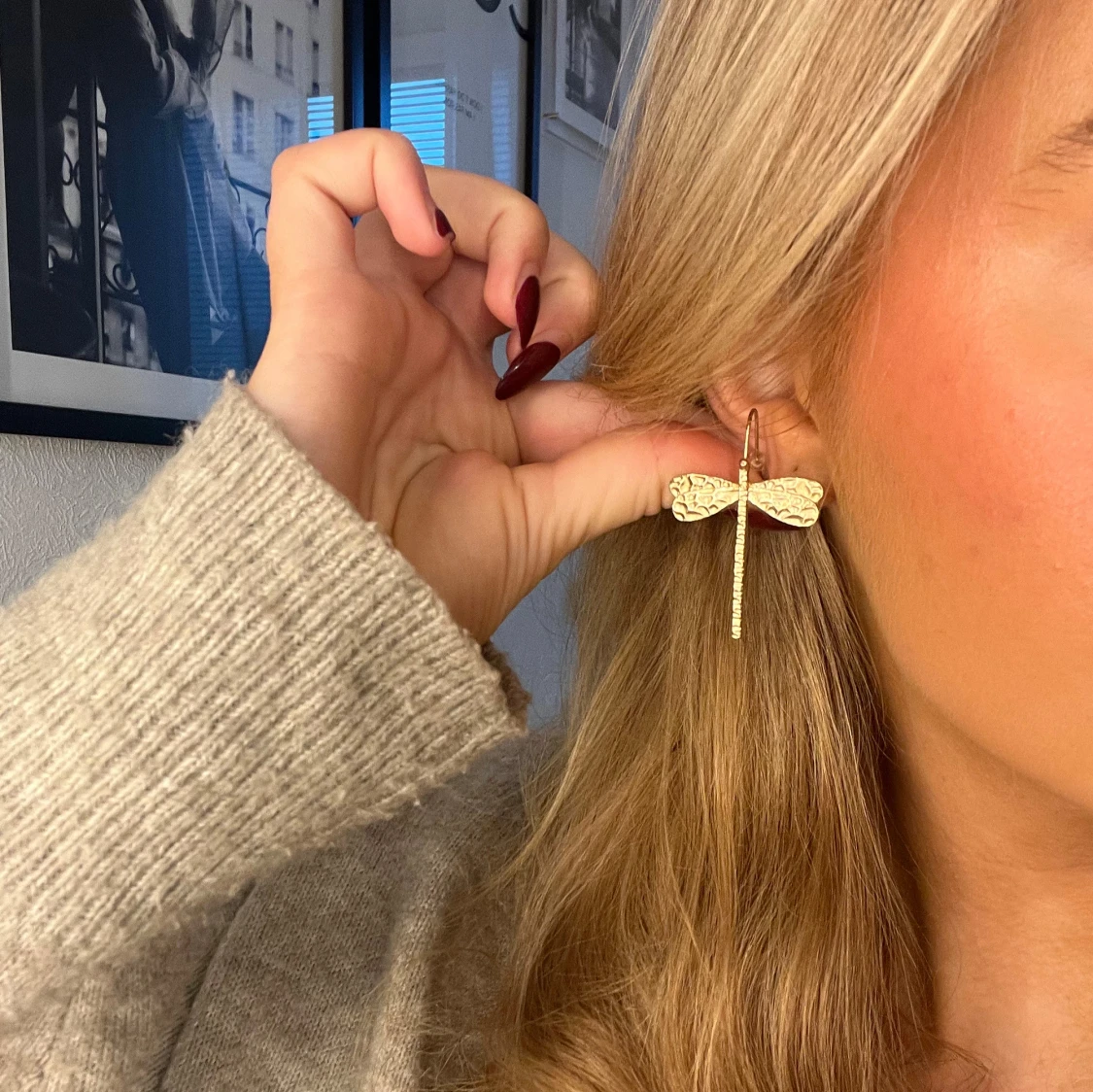 Eleganta guldörhängen formade som trollsländor. De har en detaljerad design med texturerade vingar och en lång kropp. Perfekta för att ge en unik touch till din stil.