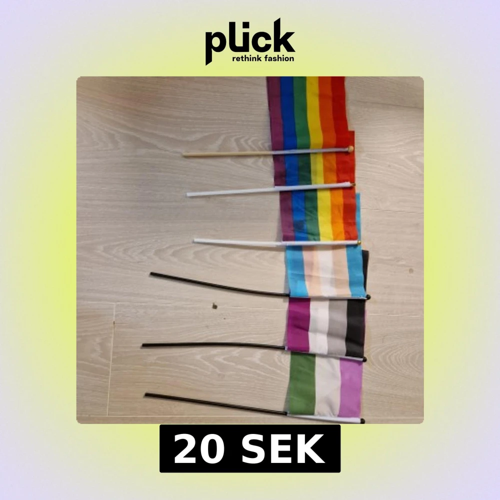 Bild på flera små flaggor i olika färger och mönster, inklusive regnbågsflaggan.