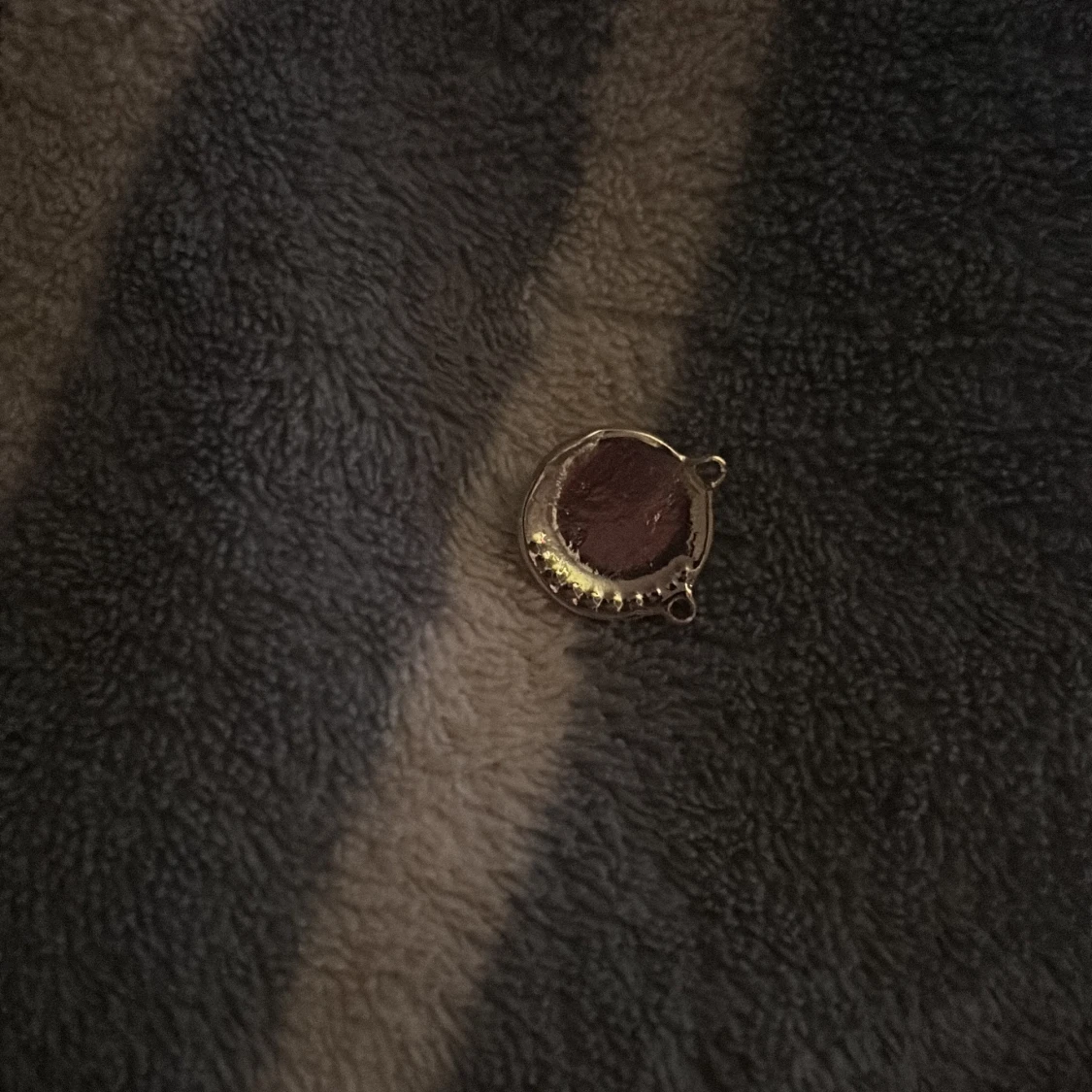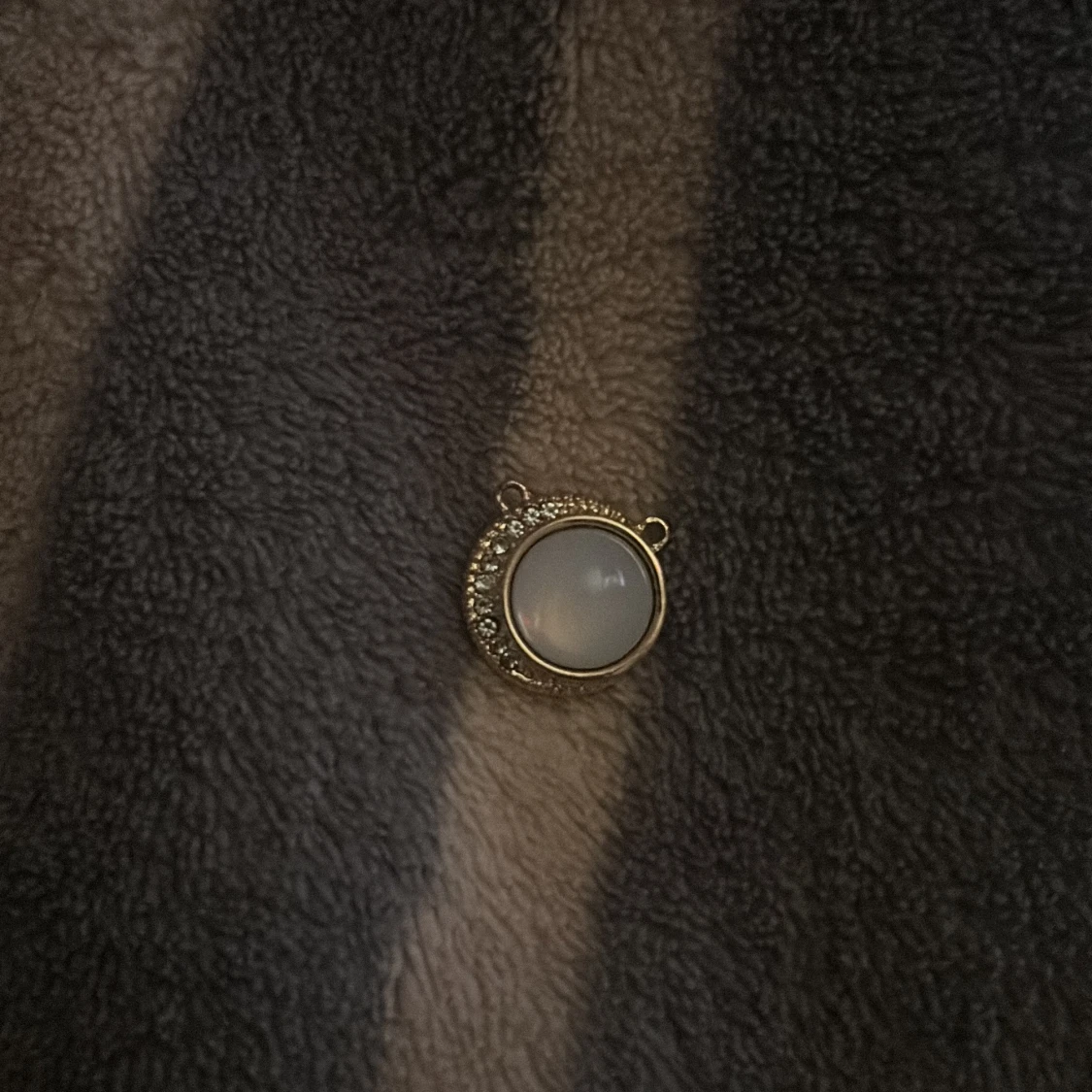 Runt hänge i guldton med en mjölkvit sten i mitten och glittriga strassdetaljer på ena sidan. Perfekt att använda som berlock till halsband eller armband. Enkel men ändå lyxig design som ger en elegant touch.