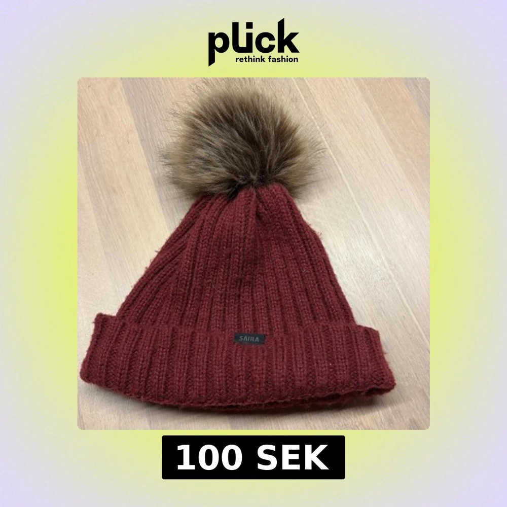 Mysig vinröd ribbstickad mössa från Sätila med stor fluffig fuskpälsboll på toppen. Mössan har uppvikt kant och är tillverkad i ett tjockt, stickat material som håller dig varm under kalla dagar.