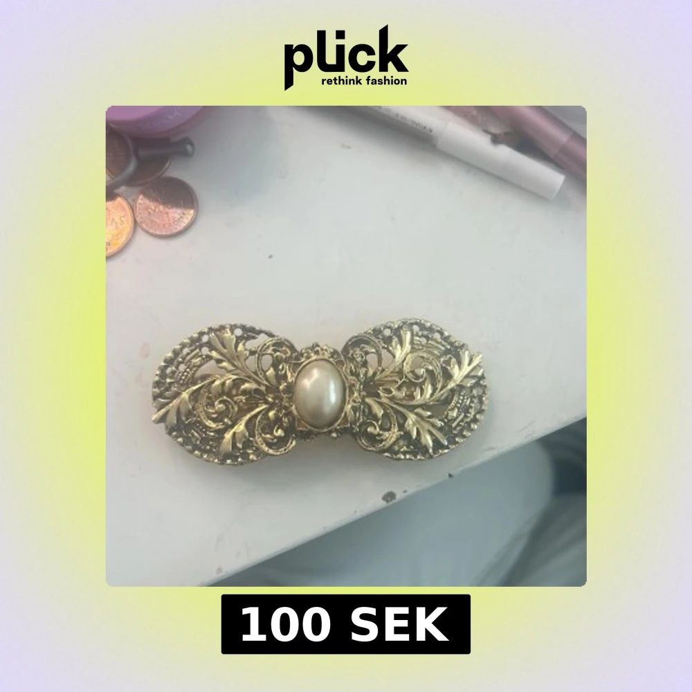 Unikt hårspänne i guldtonad metall med detaljerat, ornamenterat mönster och en stor oval pärlliknande detalj i mitten. Perfekt accessoar för att lyfta din look med en touch av vintagekänsla och elegans.