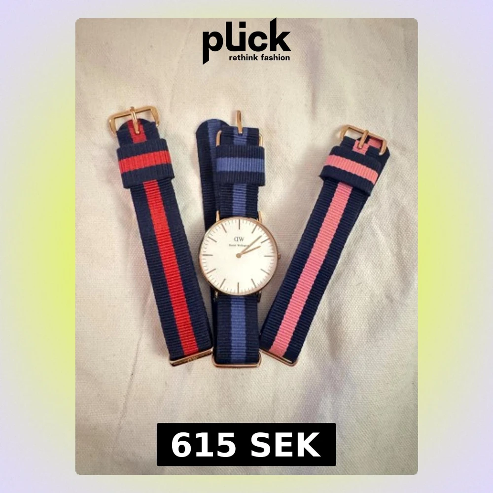 Stilren klocka från Daniel Wellington med vit urtavla, rose rund boett och tre utbytbara tygband i marinblått med röd, ljusblå eller rosa rand. Klassisk och minimalistisk design som passar till många stilar. Boett 35mm