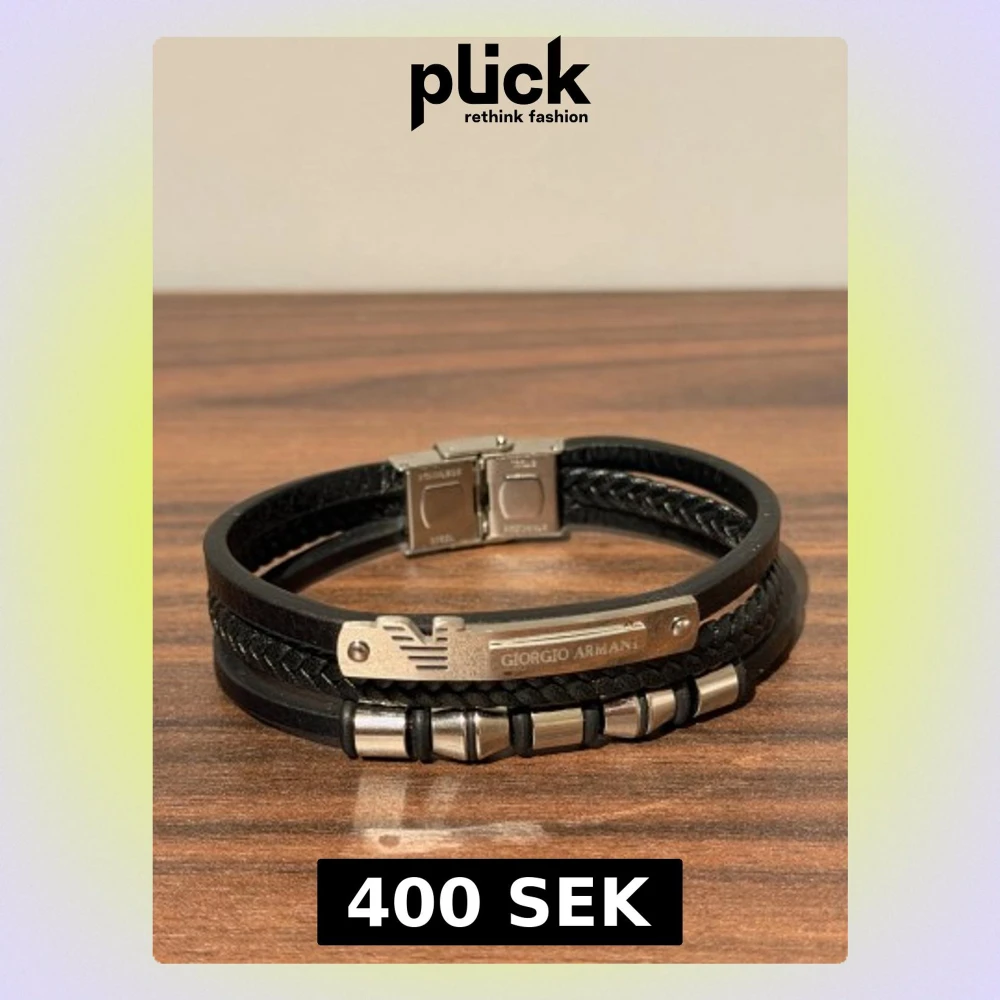 Stilrent svart armband från Giorgio Armani med flera band i läder, varav ett är flätat. Detaljer i silverfärgat rostfritt stål, inklusive logoplatta och magnetlås. Snygga metallpärlor ger extra edge till looken. Perfekt accessoar för dig som gillar exklusiv och modern stil. Aldrig använd mer än testad. Pris går att diskutera