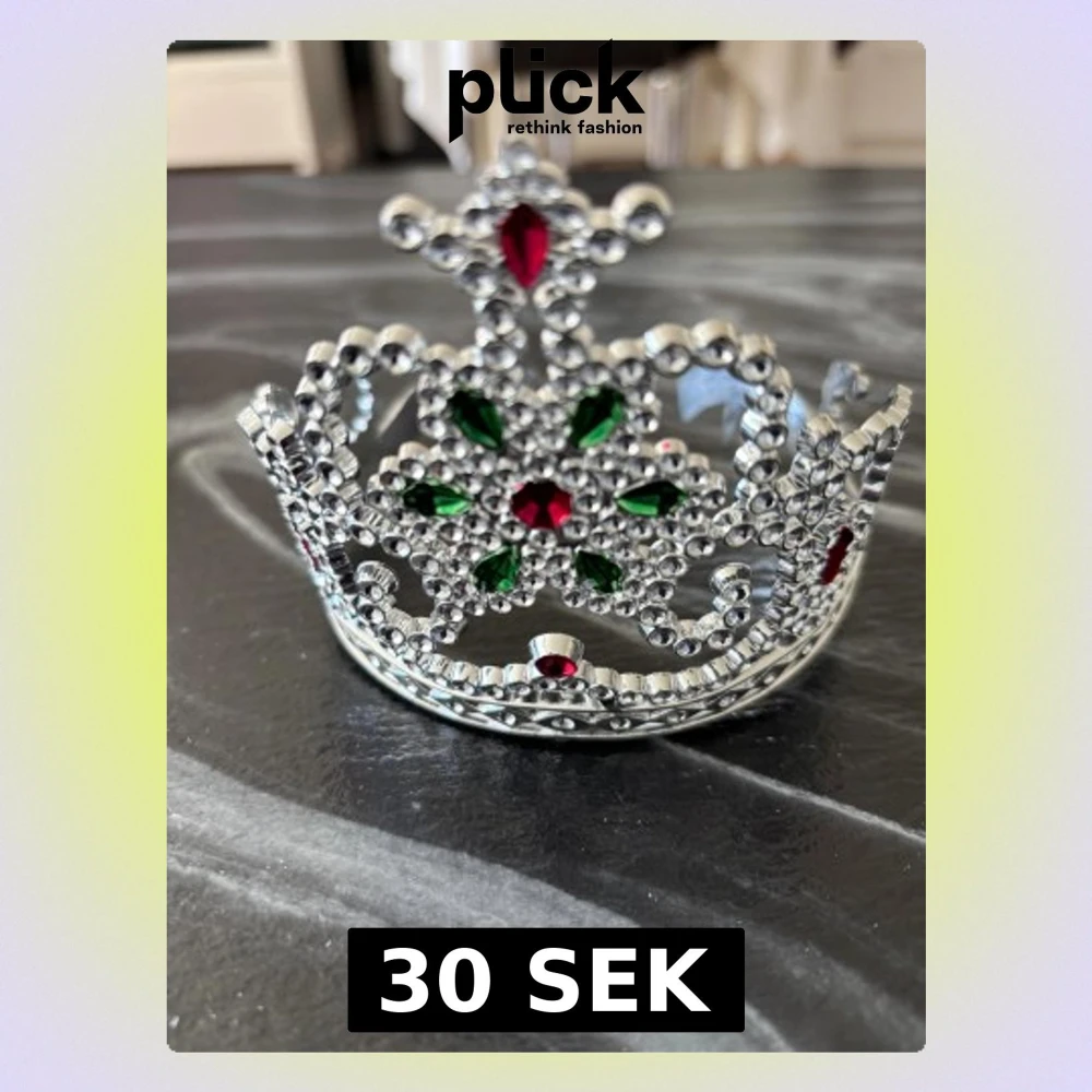 Säljer en snygg tiara i silverfärgad metall dekorerad med glittrande röda och gröna plaststenar. Kronan har en klassisk form med detaljerade mönster och gnistrande yta som verkligen sticker ut. Perfekt för dig som vill känna dig extra kunglig.