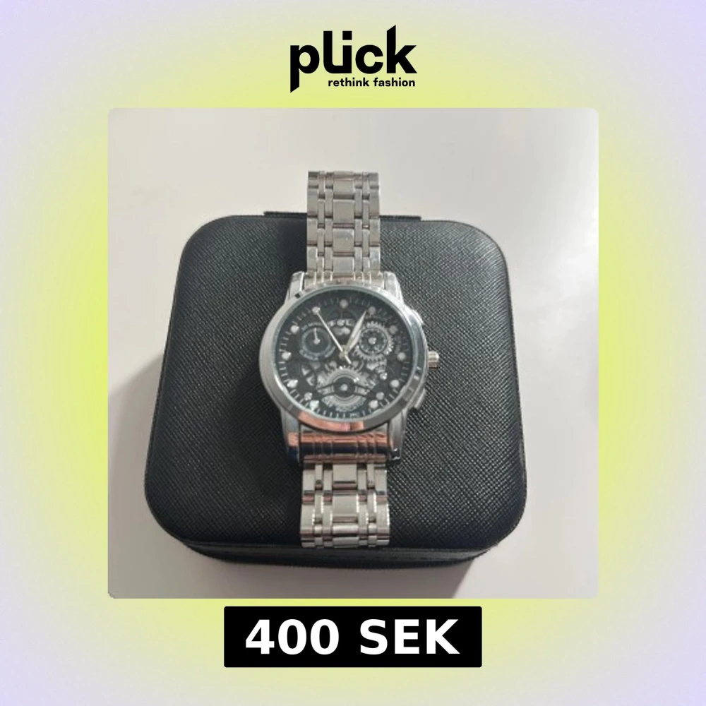 Säljer en snygg klocka i silverfärg med robust länkarmband och svart urtavla med flera detaljerade visare och kugghjul. Klockan har en klassisk rund form och metallarmband som ger en modern och cool look.