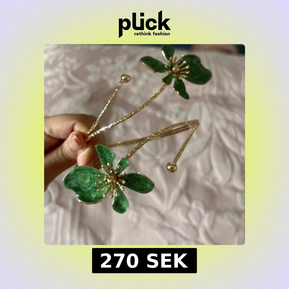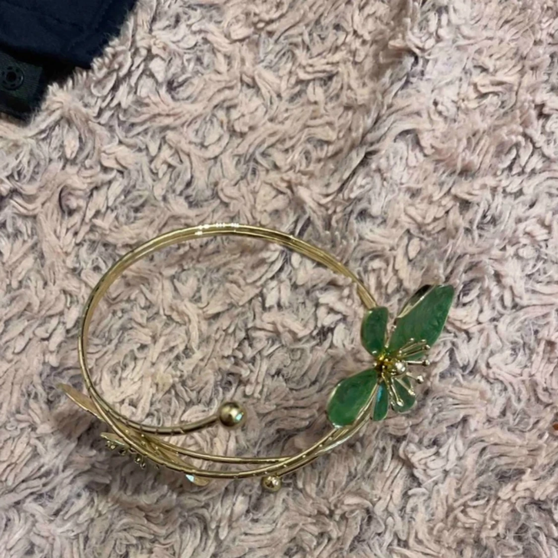 Unikt över arms armband i järn guldfärgad med två stora gröna blommor som dekoration. Blommorna har detaljerade blad och guldfärgade pistiller, vilket ger ett coolt och trendigt intryck. Armbandet är öppet och justerbart, perfekt för att sticka ut med en färgklick.